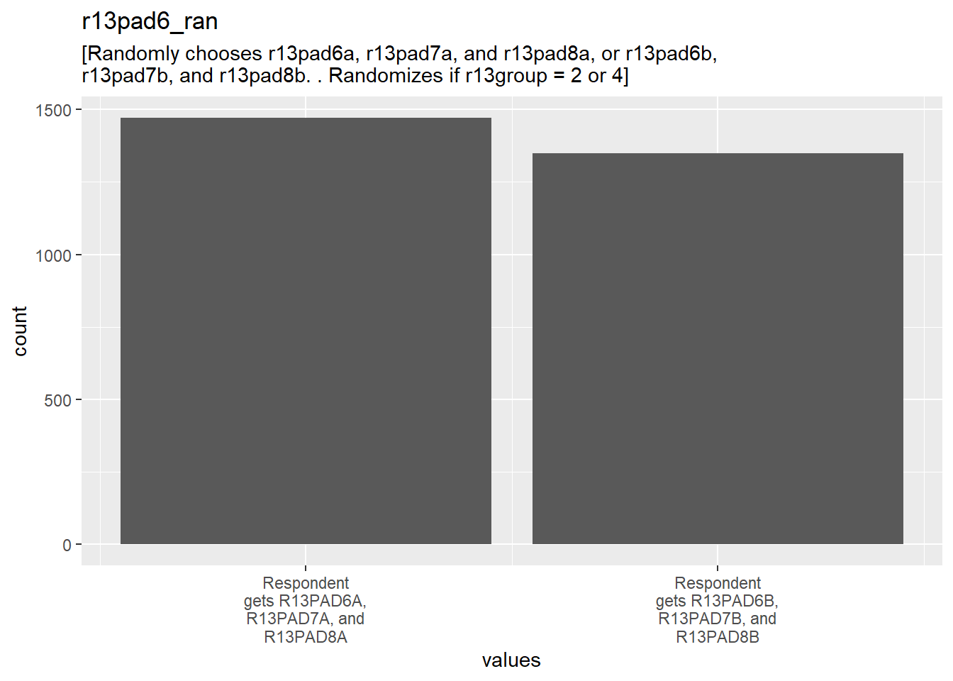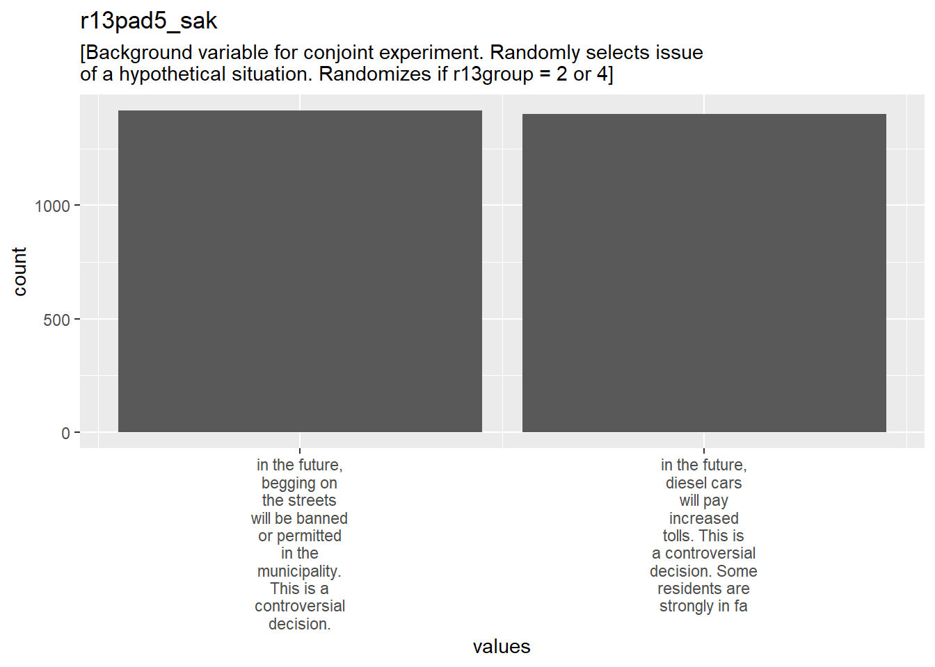 "description": "[Background variable for conjoint experiment. Randomly selects issue of a hypothetical situation. Randomizes if r13group = 2 or 4]\r\n",