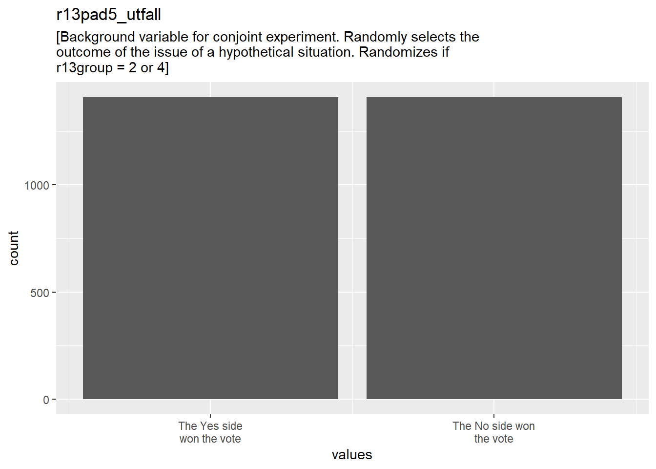 "description": "[Background variable for conjoint experiment. Randomly selects the outcome of the issue of a hypothetical situation. Randomizes if r13group = 2 or 4]\r\n",