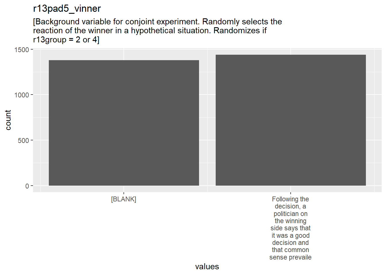 "description": "[Background variable for conjoint experiment. Randomly selects the reaction of the winner in a hypothetical situation. Randomizes if r13group = 2 or 4]\r\n",
