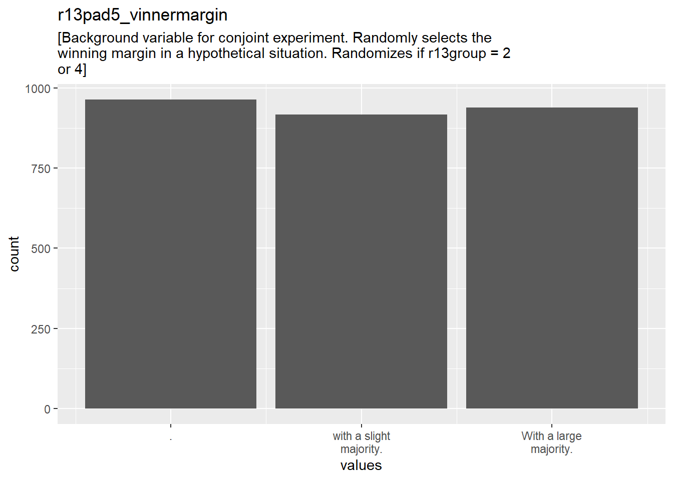 "description": "[Background variable for conjoint experiment. Randomly selects the winning margin in a hypothetical situation. Randomizes if r13group = 2 or 4]\r\n",