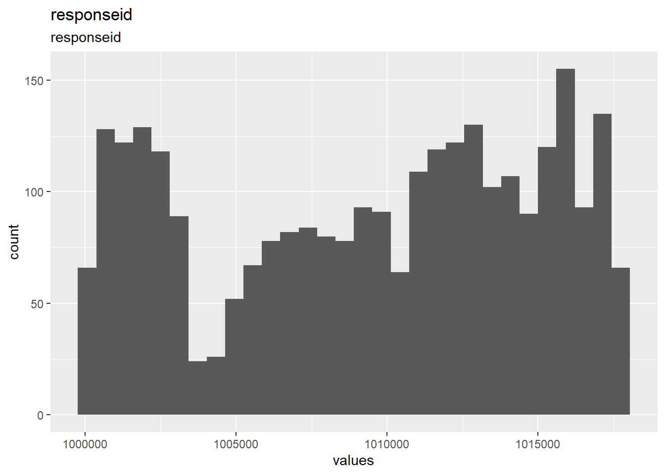 | responseid | responseid | numeric | 0 | 1 | 1e+06 | 1e+06 | 1e+06 | 1009421 | 5433 | ▇▃▆▇▇ | F8.0 |