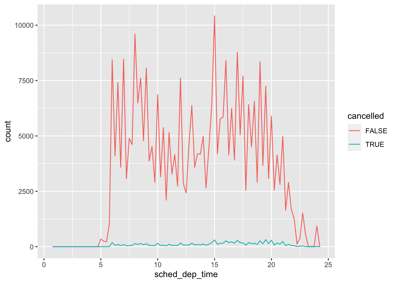 geom_freqpoly(mapping = aes(color=cancelled),
