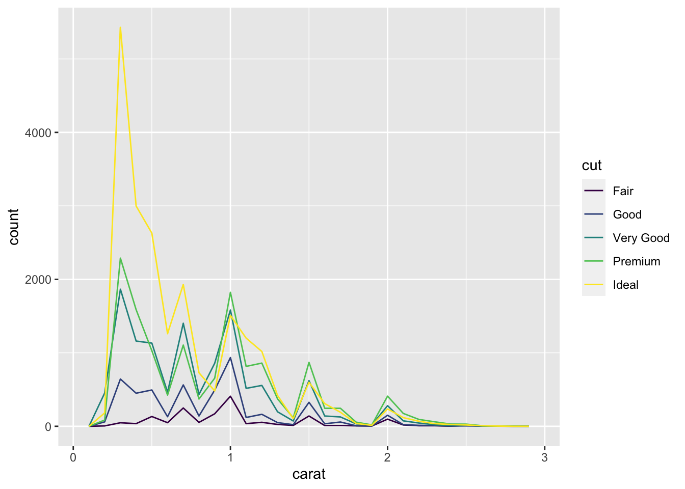 geom_freqpoly(mapping = aes(color=cut), binwidth=500)