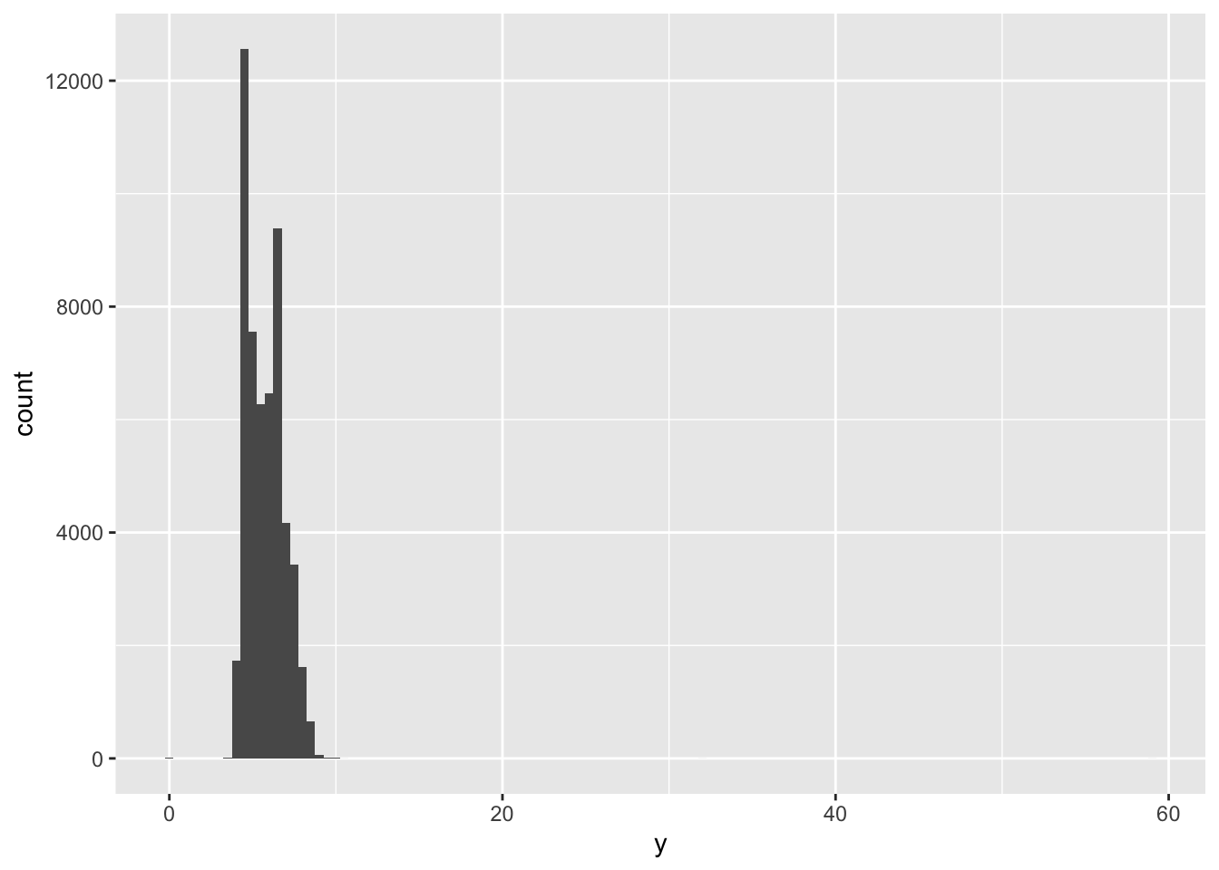 summary(diamonds2$y)## Min. 1st Qu. Median Mean 3rd Qu. Max. NA's