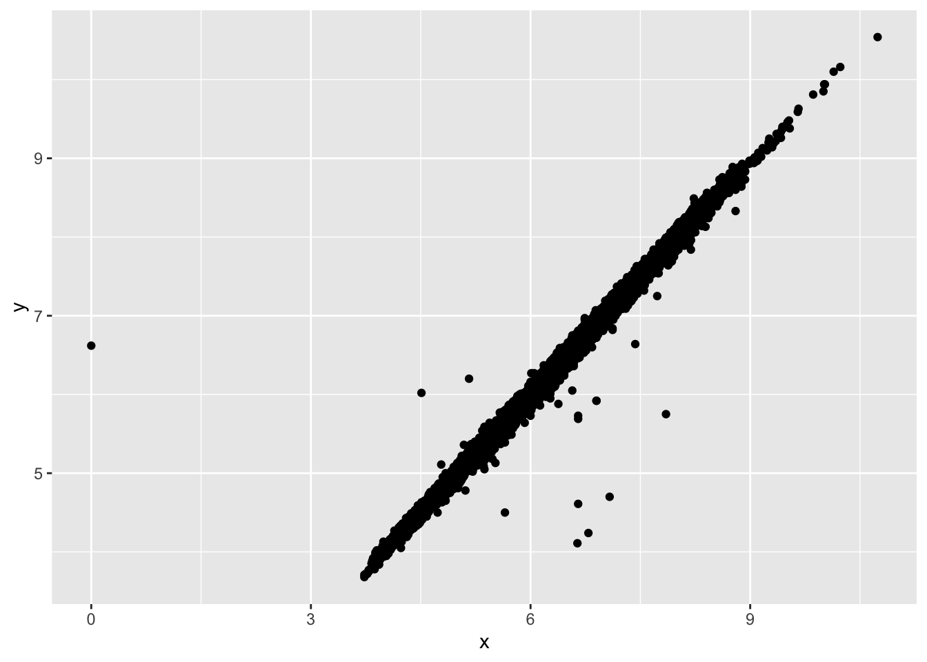 ggplot(data = diamonds2, mapping = aes(x=x, y=y))+