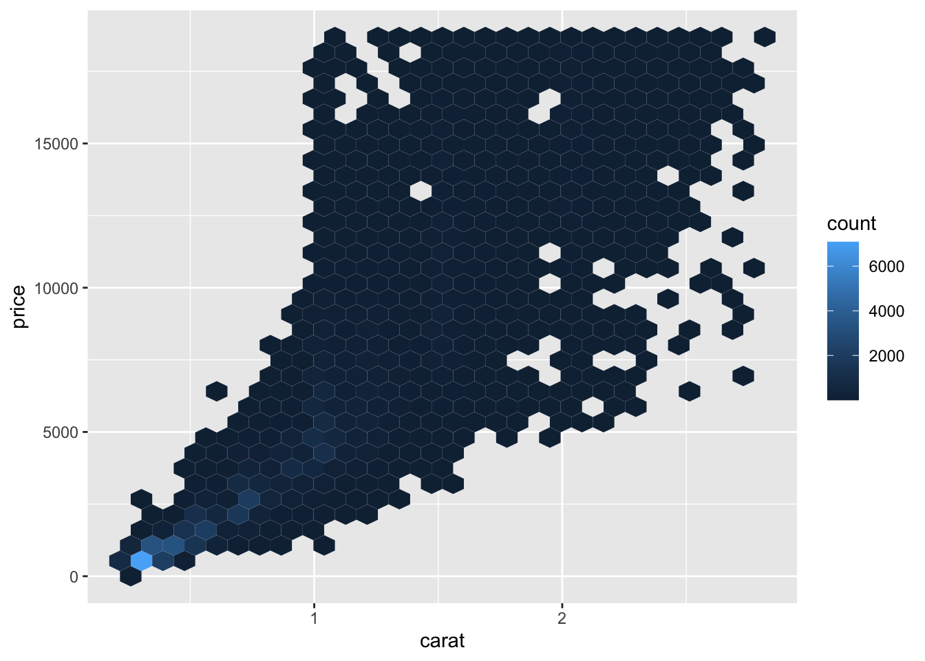 geom_hex(mapping = aes(carat, price))
