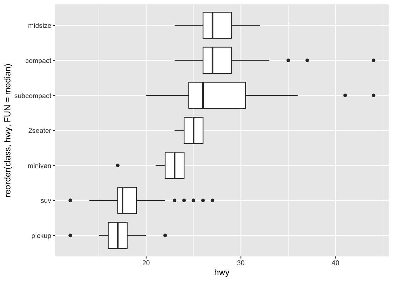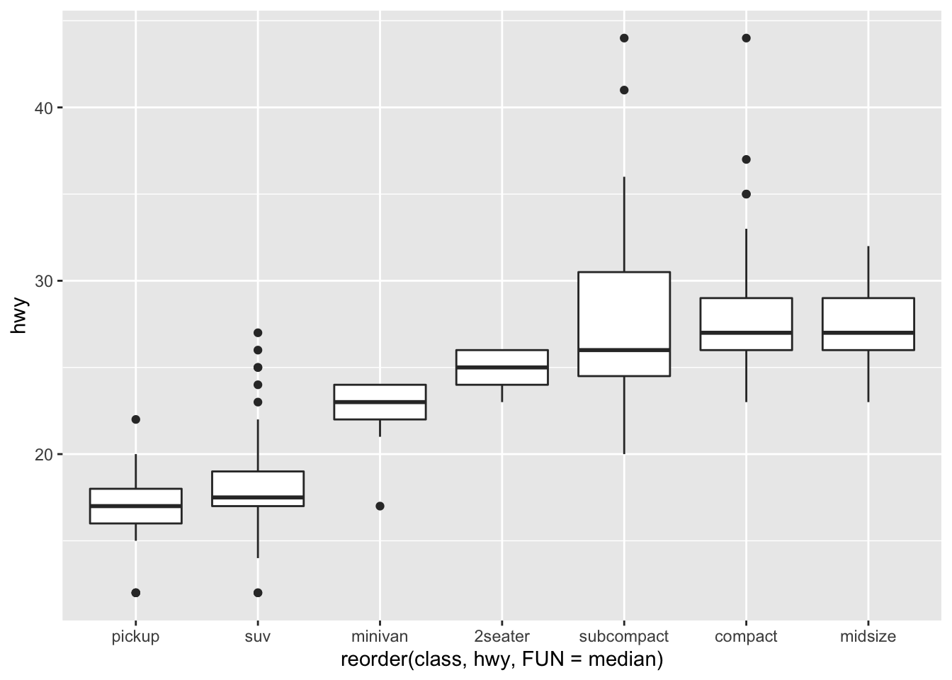ggplot(data = mpg, mapping = aes(x=reorder(class, hwy, FUN = median),