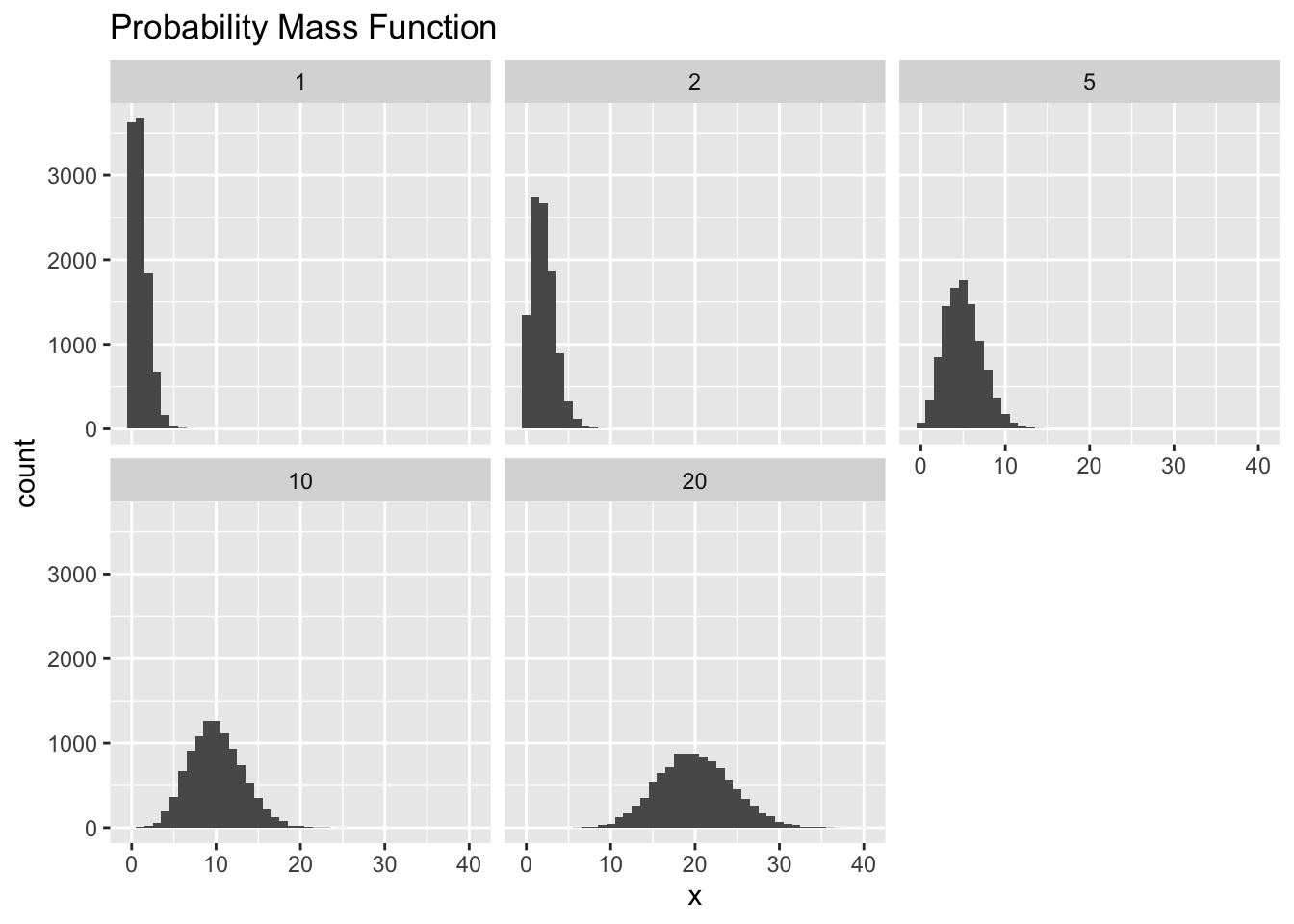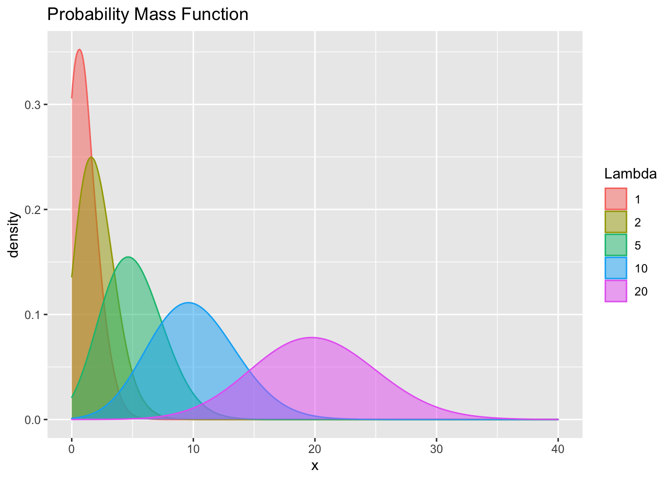pois <- melt(data = pois, variable.name = "Lambda", value.name = "x")## No id variables; using all as measure variables