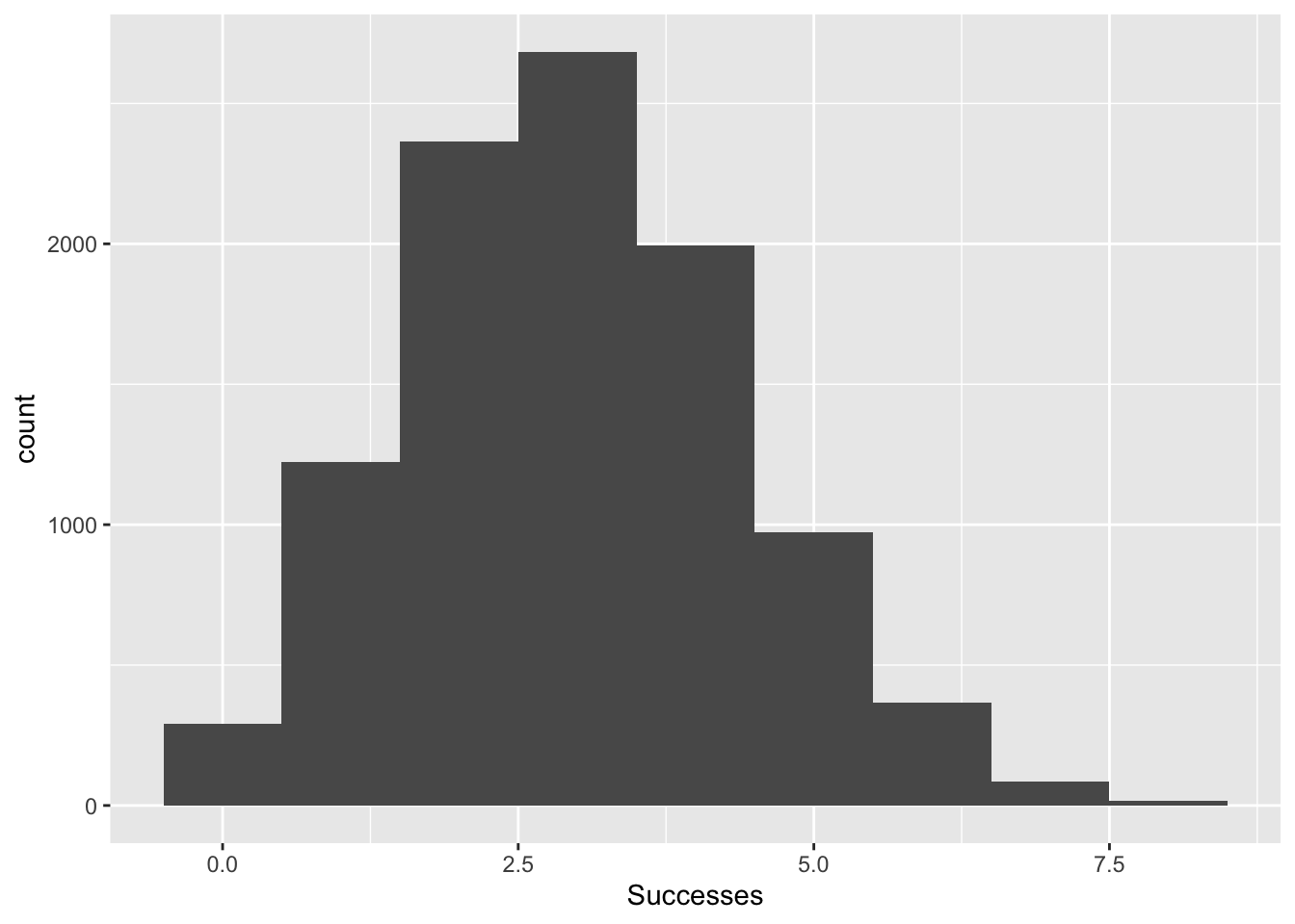 binom10 <- data.frame(Successes=rbinom(10000, 10, .3), size=10)