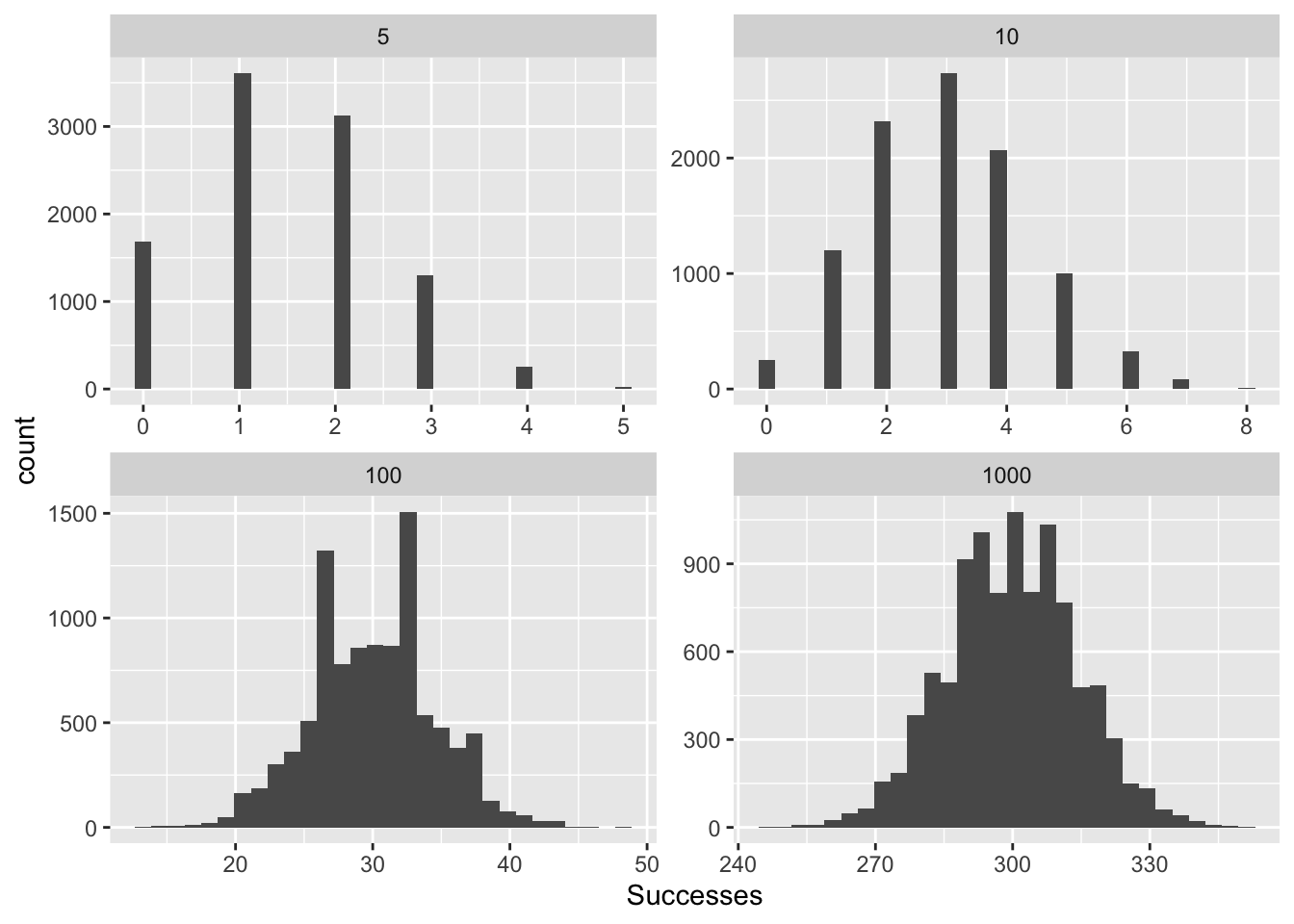 binom1000 <- data.frame(Successes=rbinom(10000, 1000, .3), size=1000)