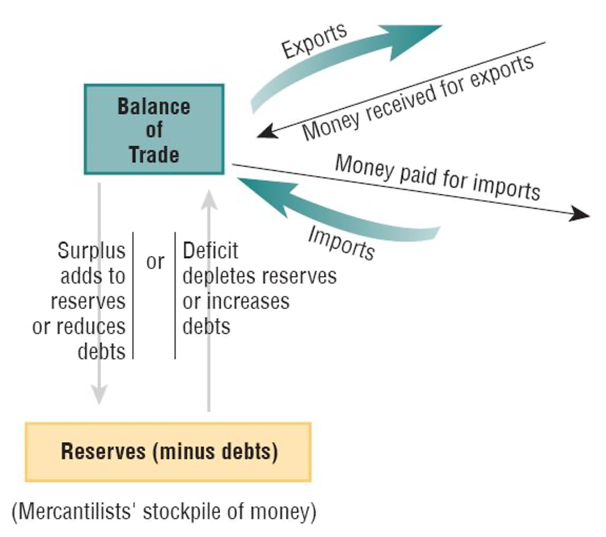 The textboxes “Balance of Trade” and “Reserves (minus debts)” have two arrows between them. The text on the arrow from balance of trade to reserves reads, “Surplus adds to reserves or reduces debts” and that on the arrow from reserves to balance of trade reads, “Deficit depletes reserves or increases debts.” Also, arrows “Exports” and “Money paid for imports” are pointing away from balance of trade and arrows “Imports” and “Money received for exports” are pointing toward balance of trade. The text below textbox reserves reads, “(Mercantilists’ stockpile of money).”