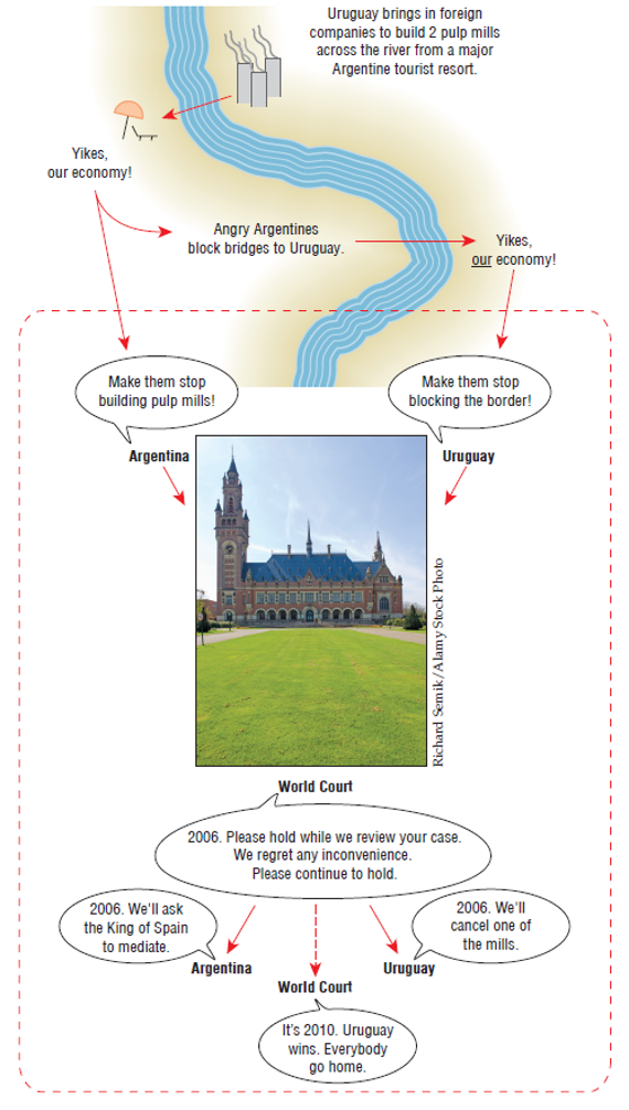 Argentina and Uruguay signed a treaty in 1975 governing the river on their border. Uruguay brings in foreign companies to build 2 pulp mills across the river from a major Argentine tourist resort.