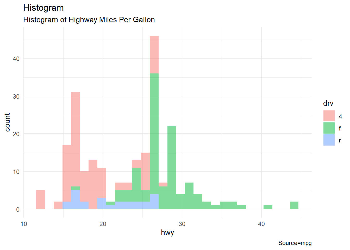 labs(title = "Histogram", subtitle = "Histogram of Highway Miles Per Gallon", x="hwy", y="count", caption ="Source=mpg")## `stat_bin()` using `bins = 30`. Pick better value with `binwidth`.