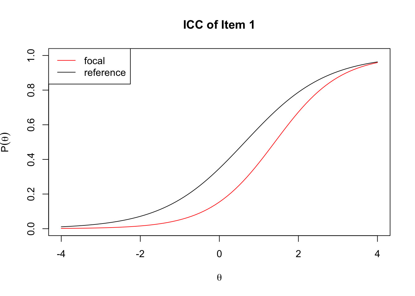 Plotting two ICCs for the reference and focal groups can visually aid in detecting DIF. Let’s draw ICCs of item 1 which had significant DIF in the previous analysis for the two groups.