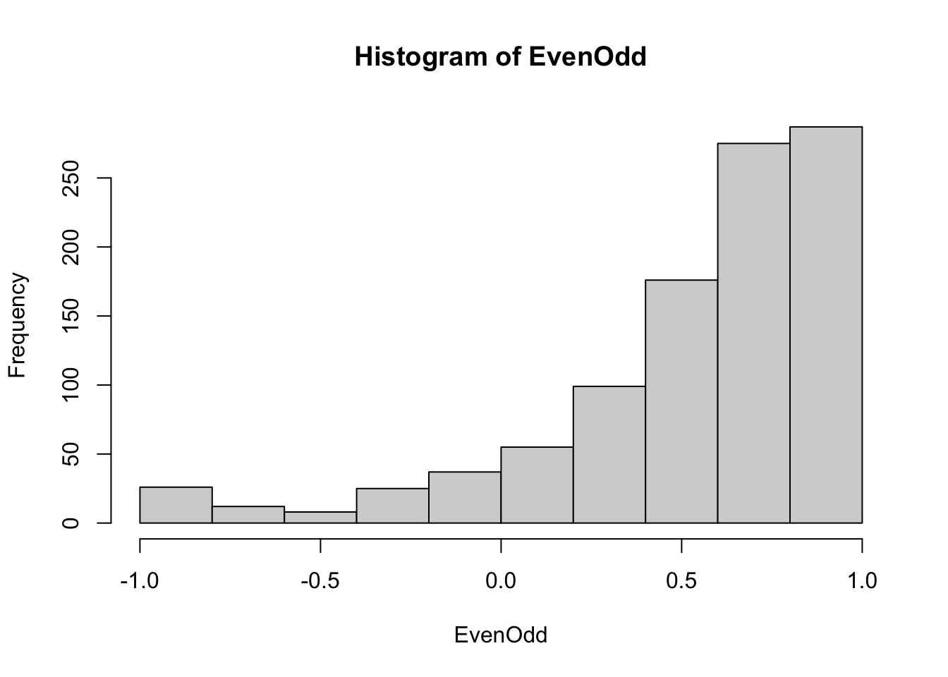 The even-odd consistency indices of all examinees are obtained by using evenodd() function. The argument factors=rep(10,10) specifies the number of items in each subscale. Note that the evenodd() function returns the negative consistency indices (also called as inconsistency indices). Therefore, we multiply by -1 to obtain the consistency indices from the evenodd() function.