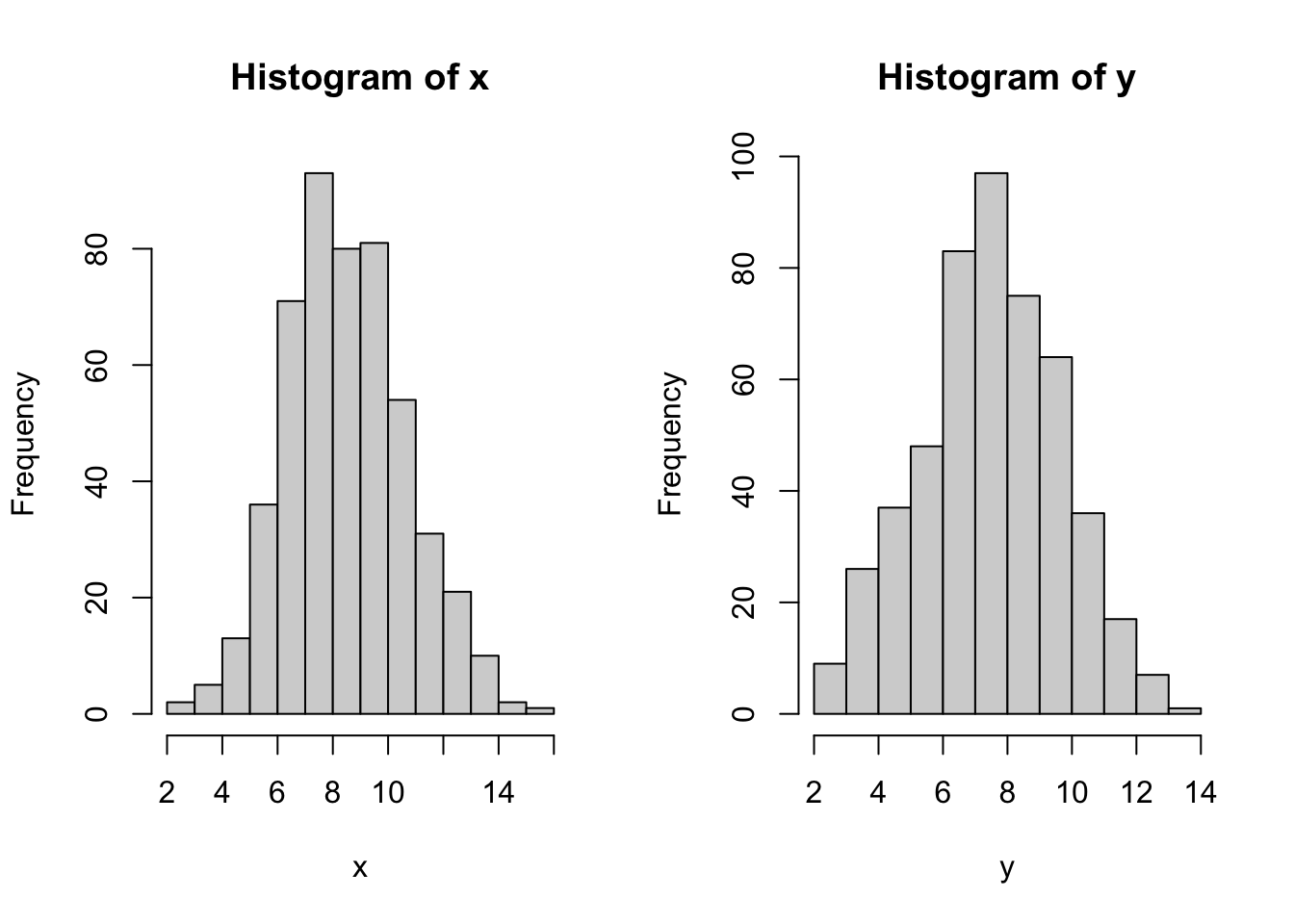 Suppose we used the job screening test score \(x\) to make decisions about hiring and to predict the job performance score \(y\). The below code chunk produces the two scores from 500 examinees. Use the test score variables \(x\) and \(y\) to solve the problems.