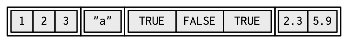 So what if you need to create a vector, containing heterogeneous objects? In this case, instead of creating an atomic vector using c(), you can create a list.