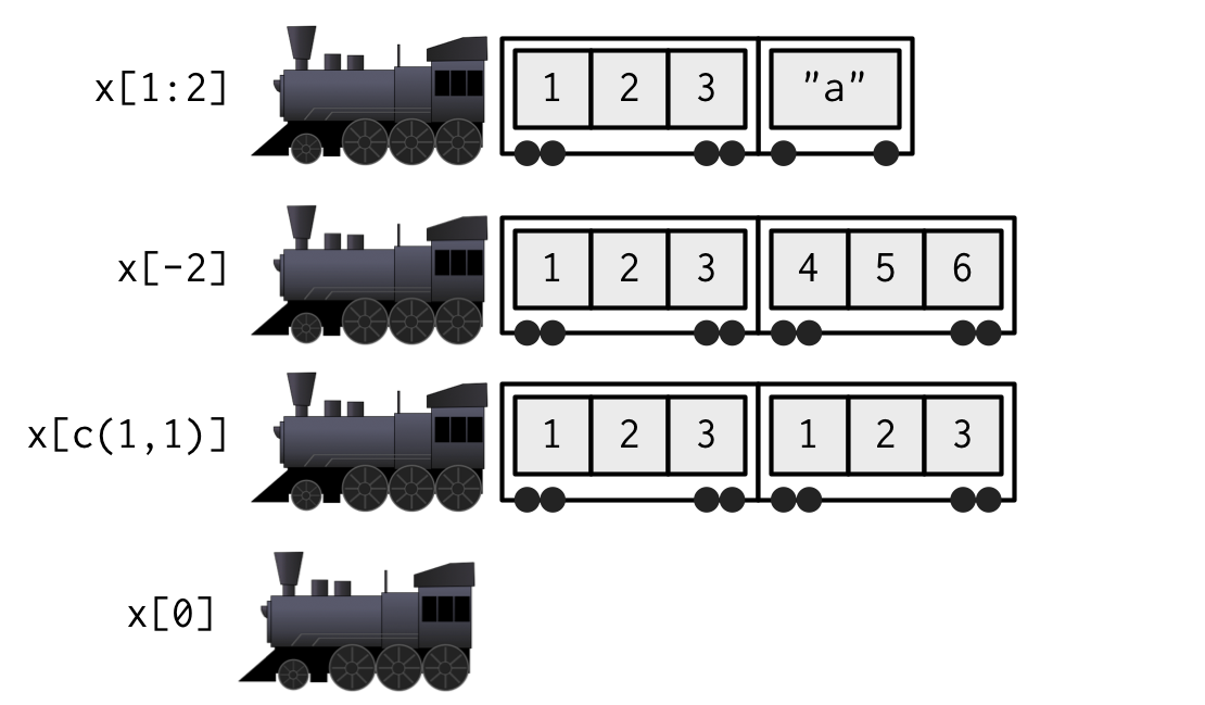 There are 2d and n-dimensional objects, e.g., matrices, data frames. We will talk about them later when we strat playing with data sets. Now, let’s use 1d vectors to introduce subsetting.