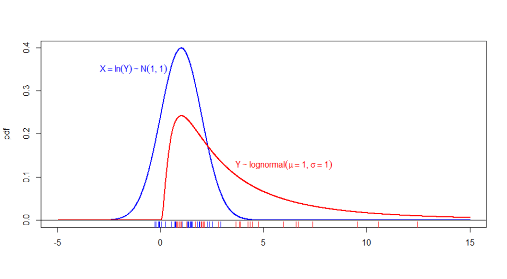 \(\Rightarrow\) if \(X\sim \mathcal{N}\left( \mu ,\sigma ^{2}\right) ,\) then \(Y=\exp(X)\sim\text{lognormal}\left(\mu ,\sigma ^{2}\right)\)