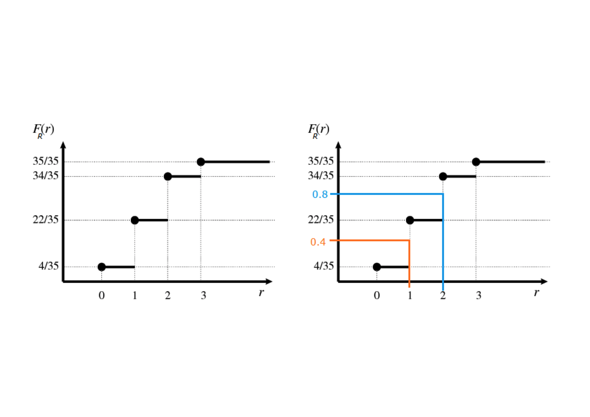 The inverse CDF \(F_X^{-1}(\alpha)\) or quantile of order \(\alpha\), and labelled as \(Q(\alpha)\), is the smallest realisation of \(X\) associated to a CDF greater or equal to \(\alpha\); in formula, the \(\alpha\)-quantile \(Q(\alpha)\) is the smallest number satisfying: \[F_X [F^{-1}_X (\alpha)] = P[X \leq \underbrace{F^{-1}_X (\alpha)}_{Q(\alpha)}] \geq \alpha, \quad \text{for} \quad \alpha\in[0,1].\] By construction, a quantile of a discrete random variable is a realization of \(X\).If we denote the random variable as \(R\), its realisations with \(r\) and the CDF evaluated in \(r\) as \(F_R(r)\), we can see graphically: