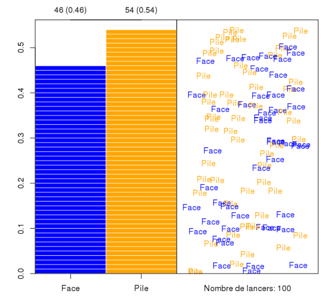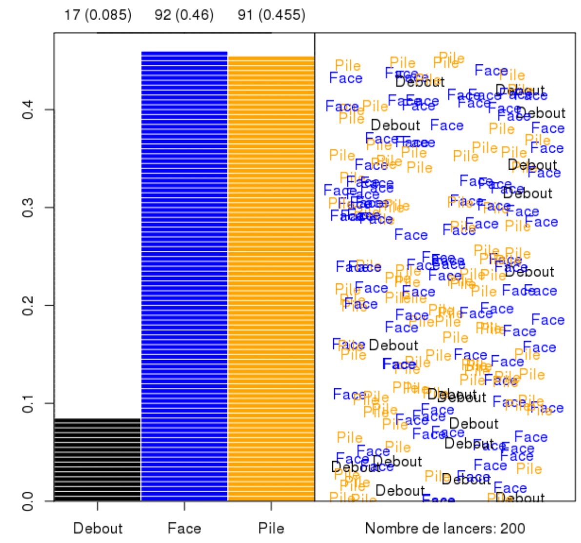 …or (even more exotic) we can simulate the outcomes of unbalanced coin \(P(H)=P(T)=0.45\) and probability of remaining on its edge \(0.1\)