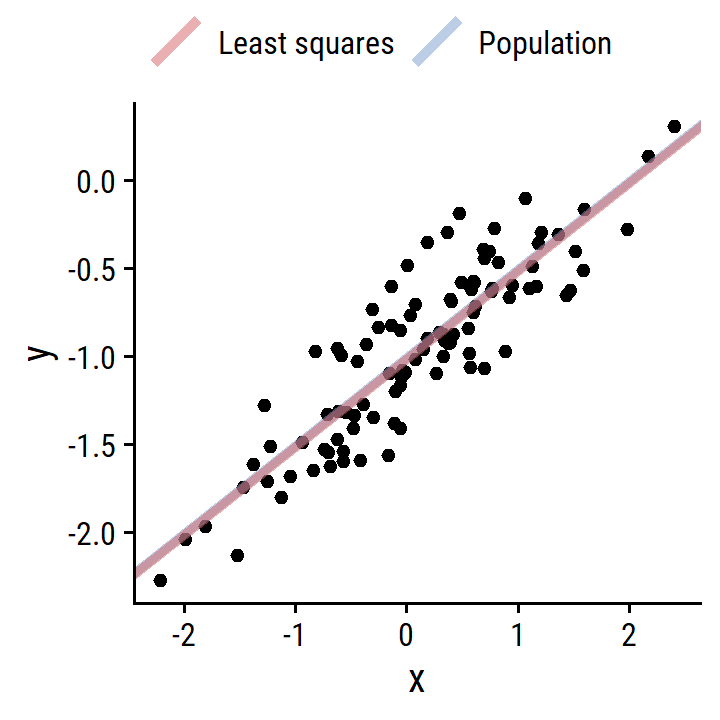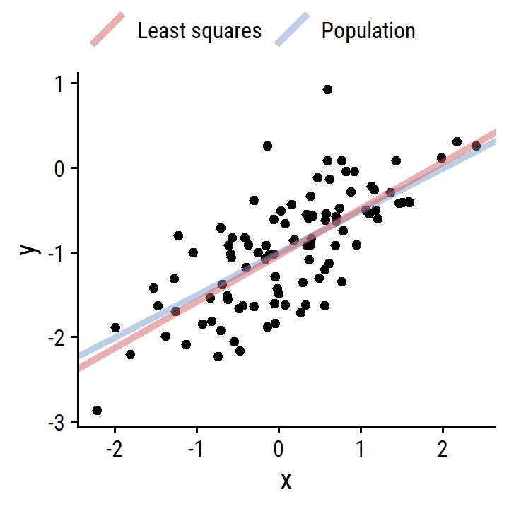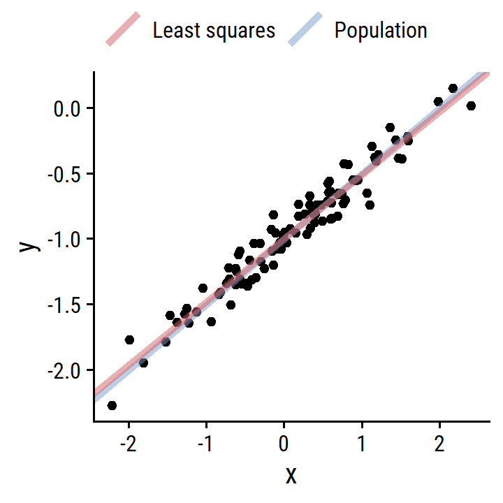 The analogy between linear regression and estimation of the mean of a random variable is an apt one based on the concept of bias. If we use the bias sample mean \(\hat{\mu}\) to estimate \(\mu\), this estimate is unbiased, in the sense that unbiased on average, we expect \(\hat{\mu}\) to equal \(\mu\). What exactly does this mean? It means that on the basis of one particular set of observations \(y_1,\dots, y_n\), \(\hat{\mu}\) might overestimate \(\mu\), and on the basis of another set of observations, \(\hat{\mu}\) might underestimate \(\mu\). But if we could average a huge number of estimates of \(\mu\) obtained from a huge number of sets of observations, then this average would exactly equal \(\mu\). Hence, an unbiased estimator does not systematically over- or under-estimate the true parameter.