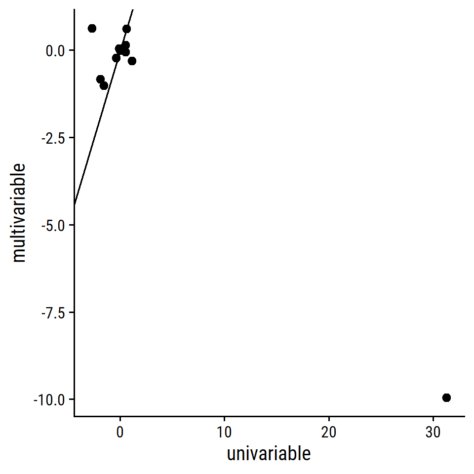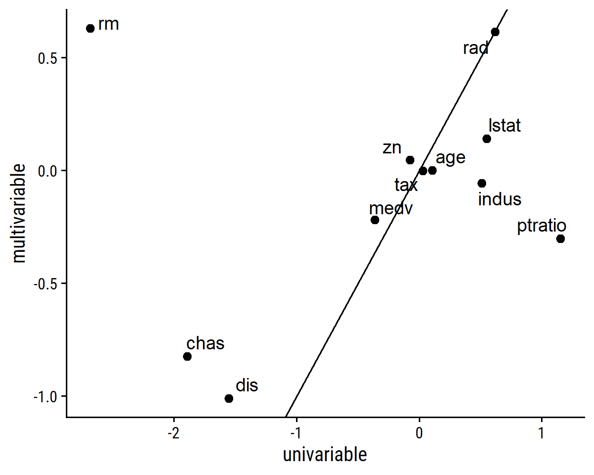 We recover the same regression coefficients: \(\beta_0\) = 7.03 and \(\beta_1\) = 0.048.