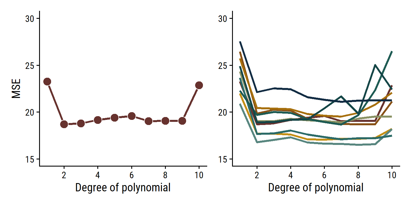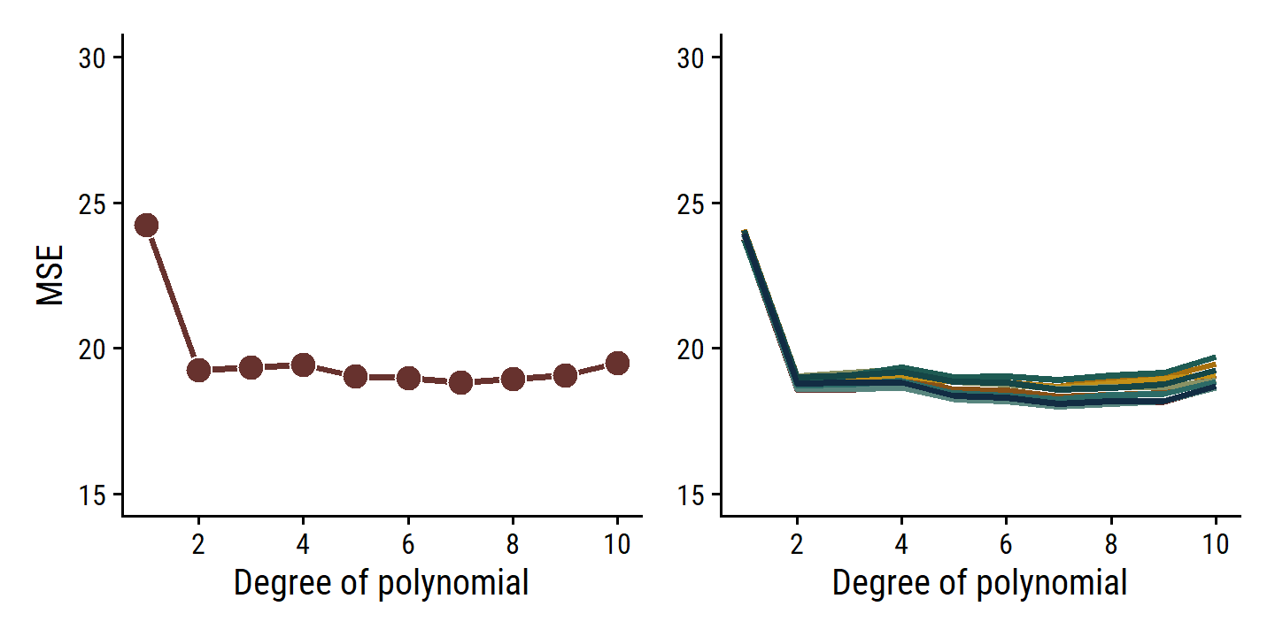 set_palette()Randomly split the data into 50% training and 50% validation, fit on the training set, and compute the MSE on the validation set.