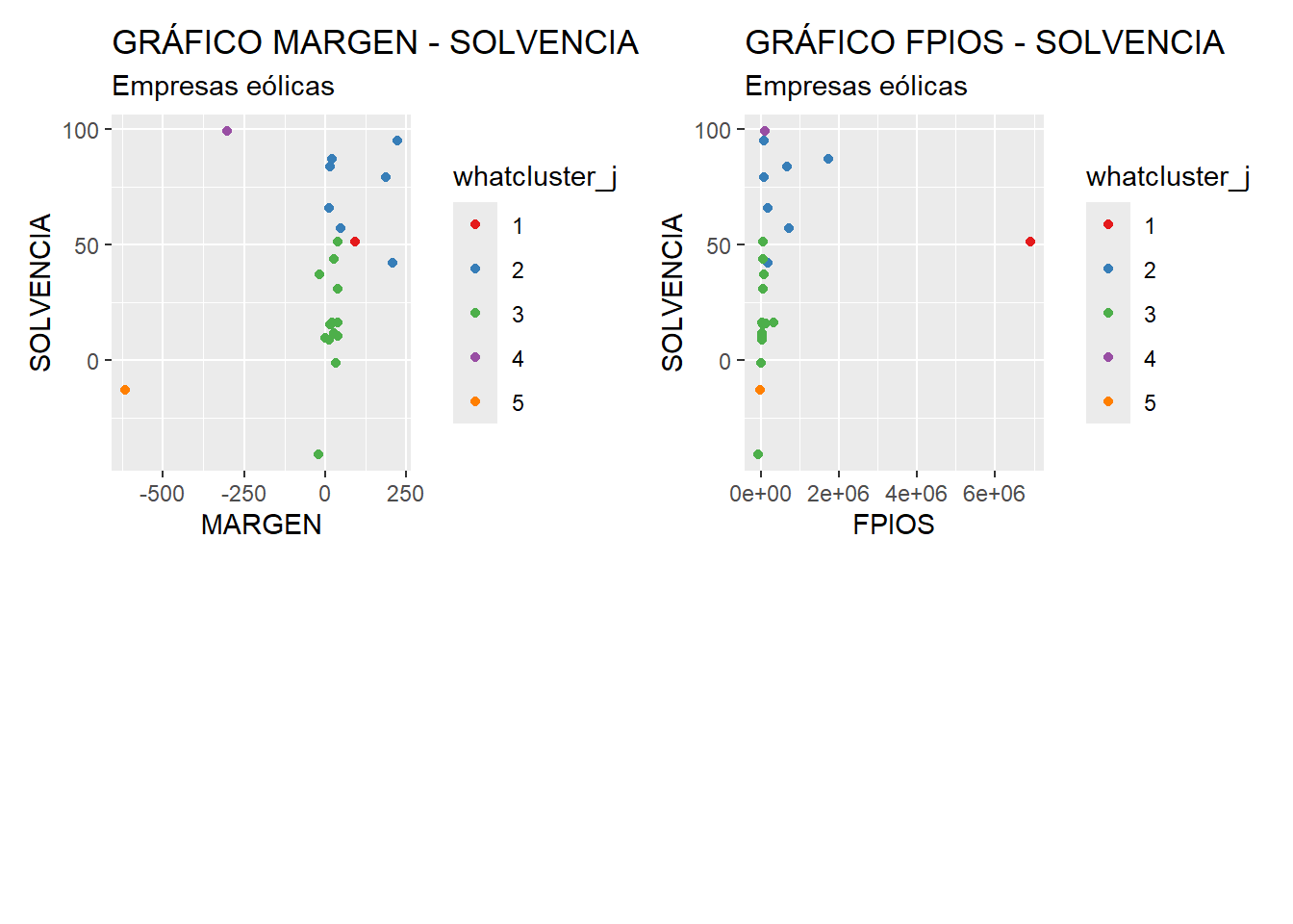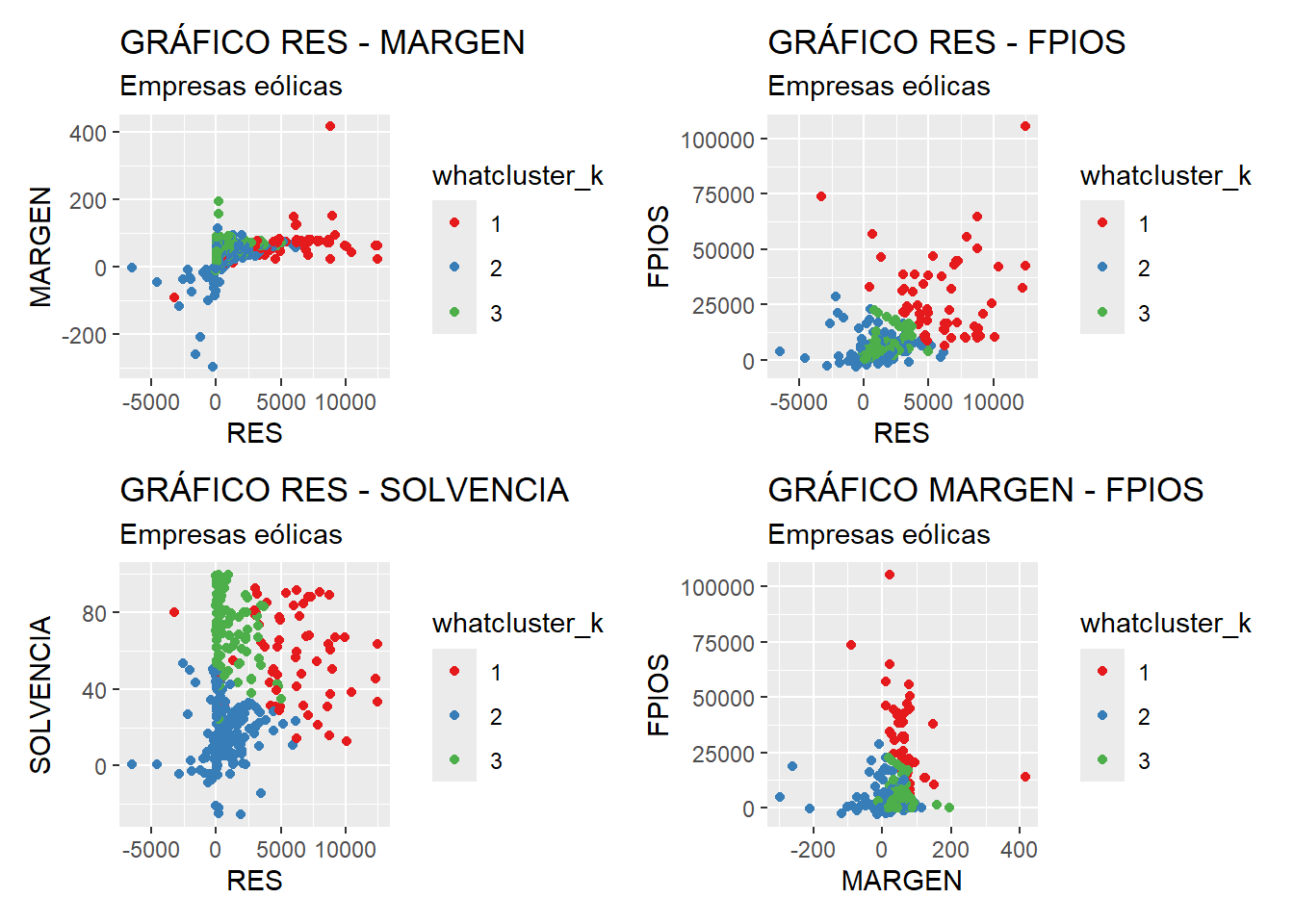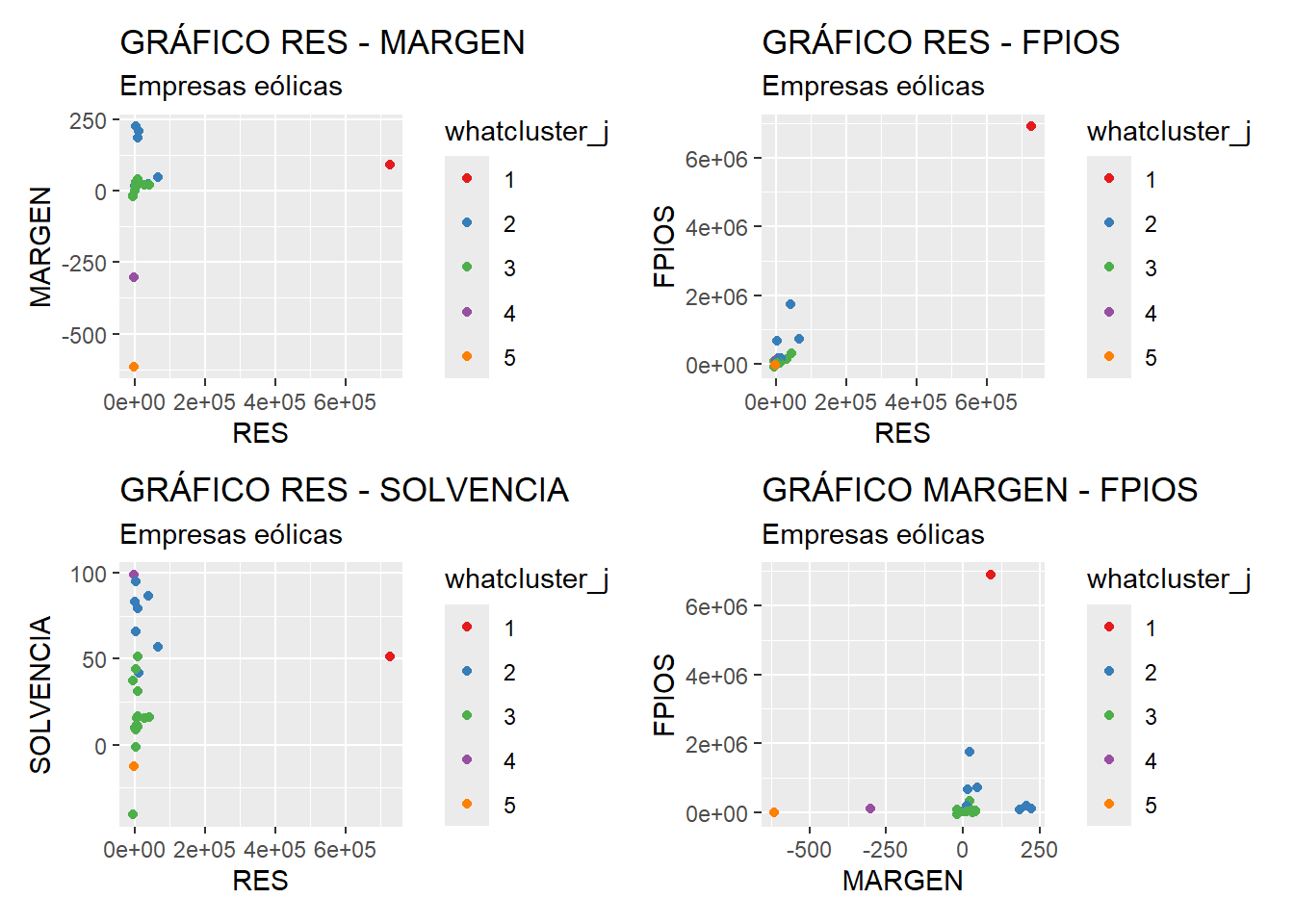 Finalmente. al centrarse nuestro objetivo en obtener perfiles de empresas más que en clasificar empresas concretas, y puesto que la muestra es numerosa, carece de sentido crear tablas con la información detallada de las empresas que componen cada uno, si bien la construcción de estas tablas es fácil, pudiéndose emplear el código que para tal objetivo se expuso en el apartado del análisis jerárquico. Lo que sí puede ser más interesante es mostrar como los elementos de cada grupo se disponen en los diagramas de dispersión producto de cruzar las variables clasificadoras entre sí. Para generar estos gráficos de un modo automatizado, primero generaremos un vector con el nombre de todas las variables (excluyendo al factor whatcluster_k mediante la función setdiff(). Luego, crearemos una lista para ir almacenando los gráficos (lista “graficos”).Después, calcularemos todas las combinaciones de nombres de variables posibles, con la función combn(), y las almacenaremos en la lista “combinaciones”. En esta función, el argumento simplify = FALSE le dice a la función que no vuelque el resultado a una matriz: