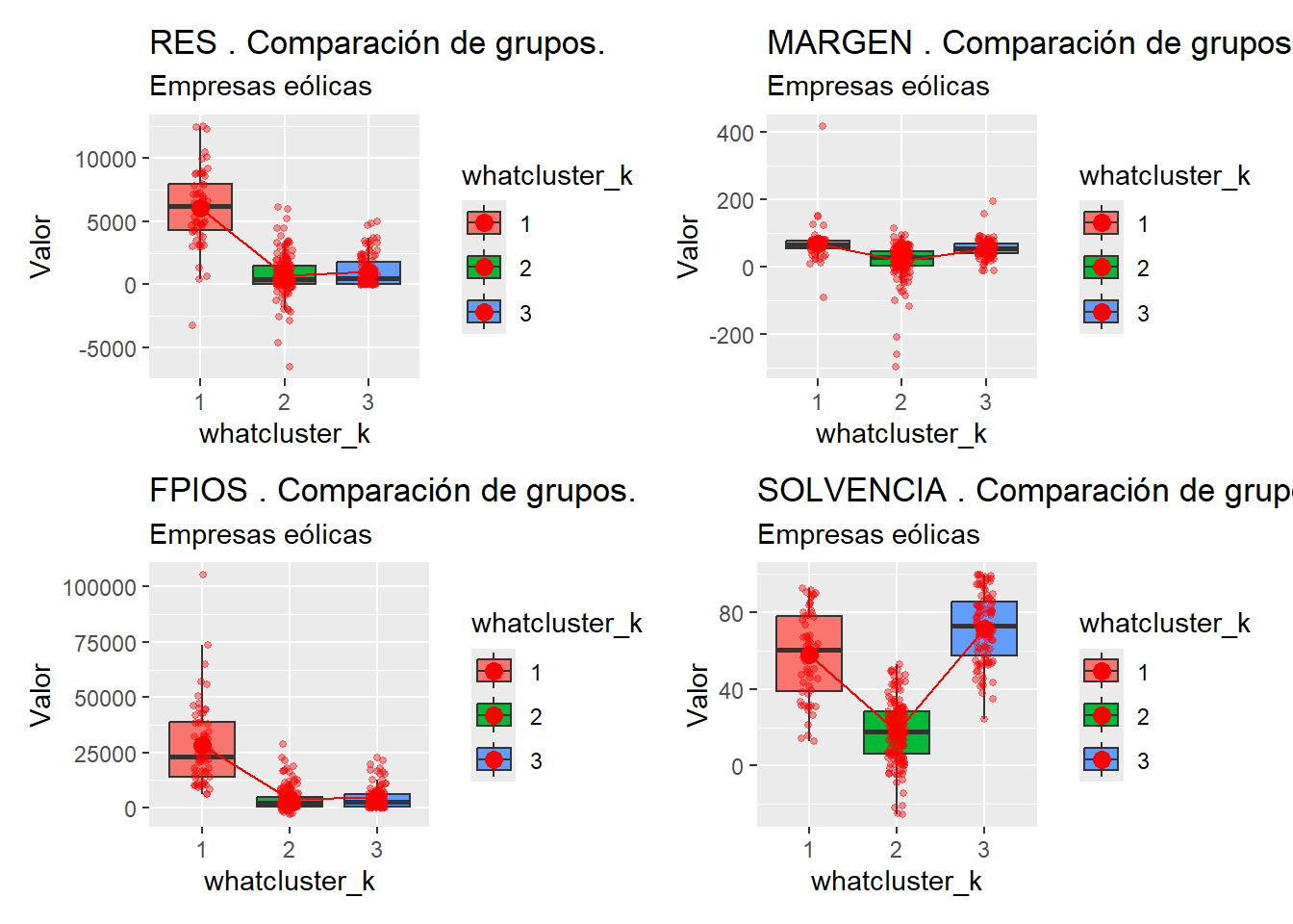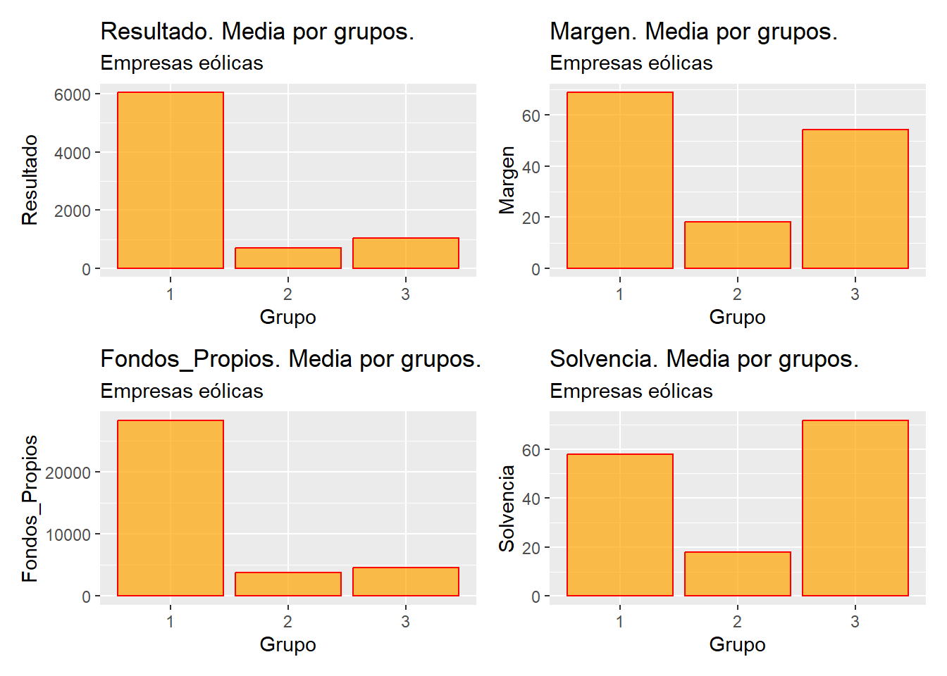 Por medio de los gráficos se pueden establecer algunas conclusiones, comparando las medias de las variables para cada grupo de casos formado (coordenadas de los centroides). Por ejemplo, el grupo 1 destaca por tener, en media, un resultado y unos fondos propios muy superiores a los del resto de grupos. En cuanto a la solvencia, también tiene en media el mayor valor, aunque la diferencia no parece tan pronunciada con respecto al grupo 3. El grupo 2 se caracteriza por tener, en media, los valores inferiores en las 4 variables clasificadoras, siempre de un modo que se antoja muy pronunciado. Por último, el grupo 3 tiene, en media, el mayor valor de solvencia y, en cuanto al margen, se sitúa relativamente cerca del margen medio del grupo 1.