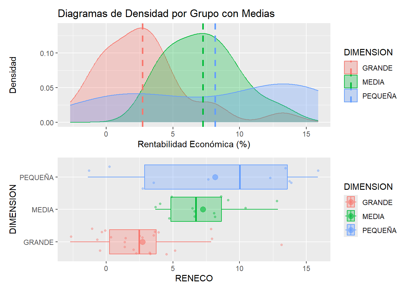 Gráficamente, las tres submuestras de empresas pueden caracterizarse, en cuanto a la rentabilidad económica (RENECO), mediante dos tipos de gráficos: gráficos de densidad y gráficos de caja. Los gráficos serán construidos utilizando las facilidades del paquete {ggplot2}. Además, combinaremos los gráficos en una composición utilizando el paquete {patchwork}. El código es el siguiente: