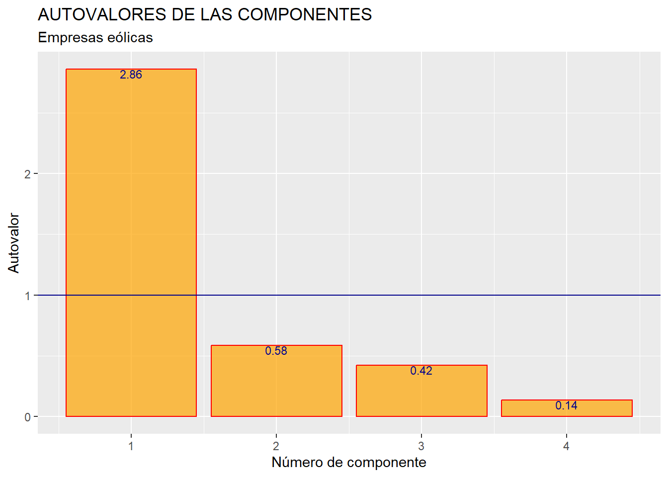 En el gráfico obtenido se advierte que solo el primer autovalor es mayor que 1, por lo que solo se retendrá la primera componente, que será la única componente principal. Nuestro objetivo era, de todos modos, obtener un único indicador (de “solidez del negocio”) que resuma la información contenida en las cuatro variables RES, FPIOS, MARGEN y SOLVENCIA, por lo que, aunque hubiera habido más componentes con autovalor mayor que uno, solo hubiéramos seleccionado la primera. No obstante, este resultado es positivo para nuestros intereses, ya que reafirma la idea de que únicamente con la primera componente se recoge una gran proporción de la comunalidad o varianza conjunta (comportamiento) de las 4 variables, luego es un buen resumen global de las mismas. Esto ya se vio anteriormente al hacer summary (componentes), aunque se puede representar gráficamente con el siguiente código: