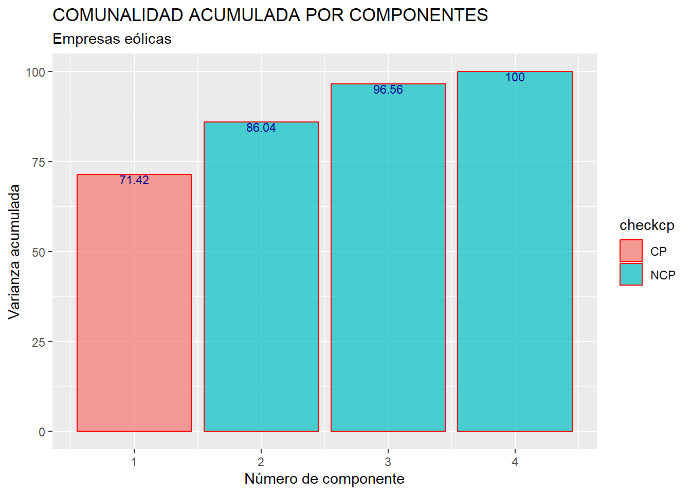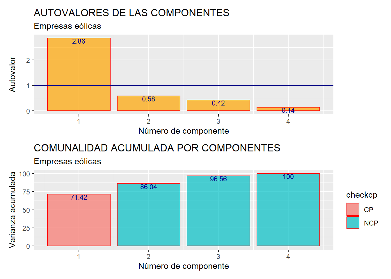 Después, se ha creado un vector que contiene tantos elementos como variables o componentes hay en el análisis (vector “checkcp”). Con la función condicional ifelse() se consigue que los elementos de “checkcp” sean “CP” o “NCP” según los correspondientes autovalores sean mayores o no que 1. Finalmente, según sea el valor de cada elemento de “checkcp”, las barras del gráfico se colorearán de uno u otro modo.