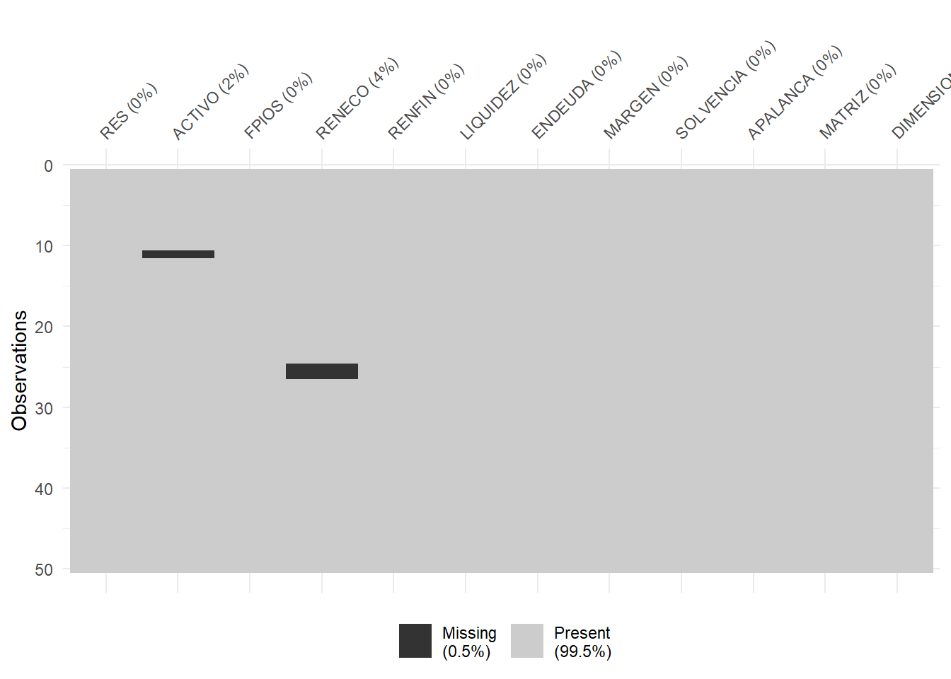 Tras el código anterior, se han eliminado del data frame “muestra” las empresas “Sargon Energías S. L. U.” y “Viesgo Renovables S. L.”, empresas pertenecientes a grupos empresariales de dimensión media (DIMENSION), debido a que carecían de dato de rentabilidad económica (RENECO).