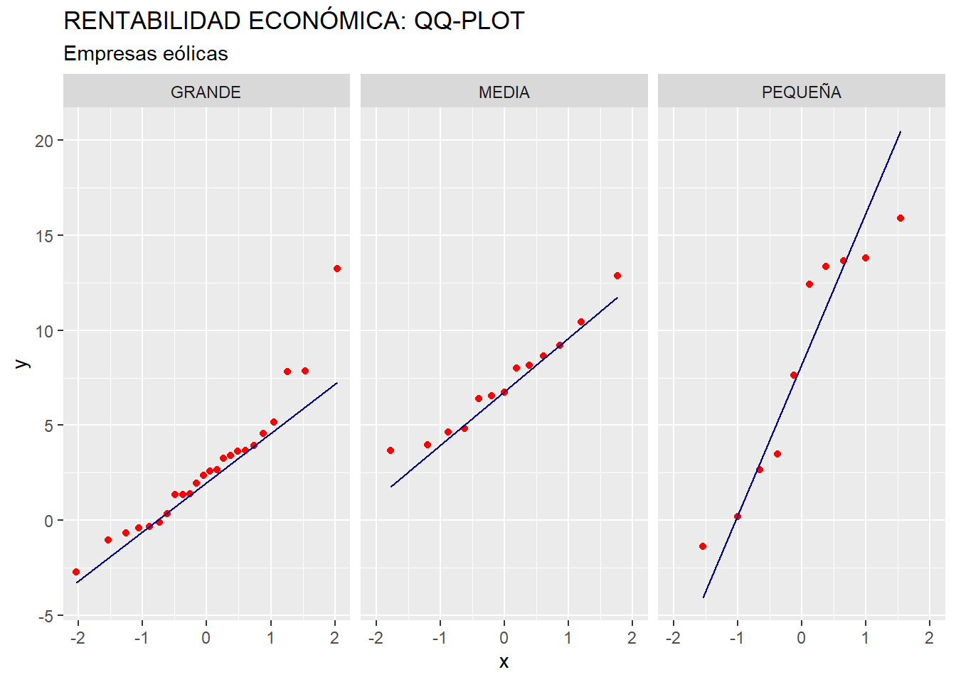 Los gráficos QQ parecen inidicar que la variable RENECO tiene un comportamiento distante a la Ley Normal en las submuestras (y, por tanto, en las correspondientes subpoblaciones), al localizarse, algunos de los puntos, relativamente alejados de la diagonal, especialmente en el caso de las empresas pertenecientes a matrices de dimensión “grande”. Para extraer una conclusión de un modo más preciso, vamos a realizar el contraste de normalidad de Shapiro-Wilk: