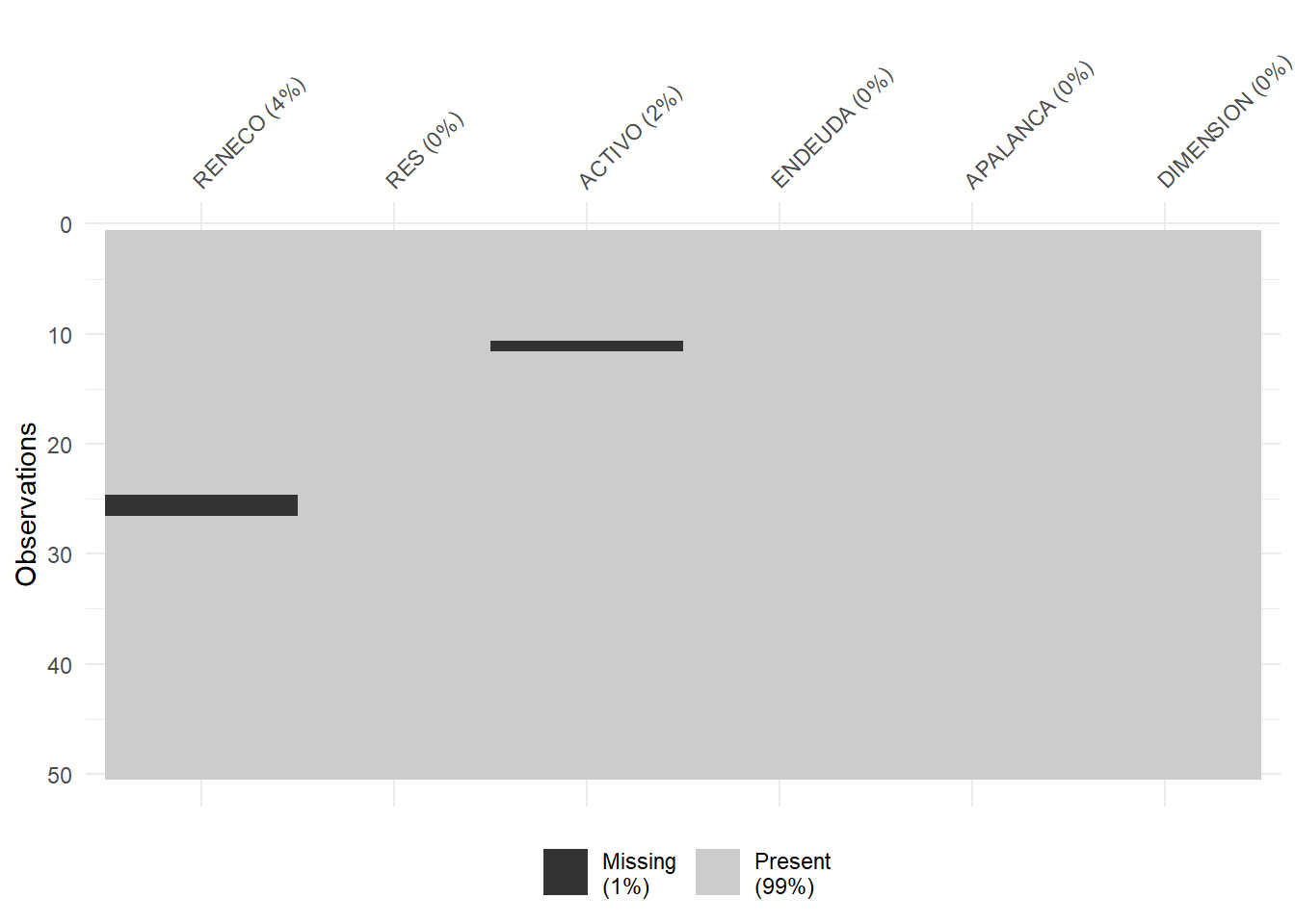 Así, una vez abierto el script en el editor de RStudio , comprobaremos que la primera parte del código está dedicada a la limpieza de la memoria (Environment) y a la importación de los datos. Para ello, activaremos el paquete {readxl} y utilizaremos la función read_excel(), indicando en los argumentos el archivo a explorar, y la hoja en la cual se encuentran los datos (hoja “Datos”). También hemos de prestar atención a la cuestión de si existen en la hoja de Excel anotaciones en las celdas donde no haya dato, para completar adecuadamente el argumento na= . Los datos se almacenarán en el data frame “datos”. En este data frame, la primera columna no es una verdadera variable, sino que se compone de los nombres de los casos o empresas. Con una línea de código adicional transformaremos esa primera columna en el nombre de las filas, de modo que tal columna abandona su rol de variable. En definitiva, el código para importar los datos es: