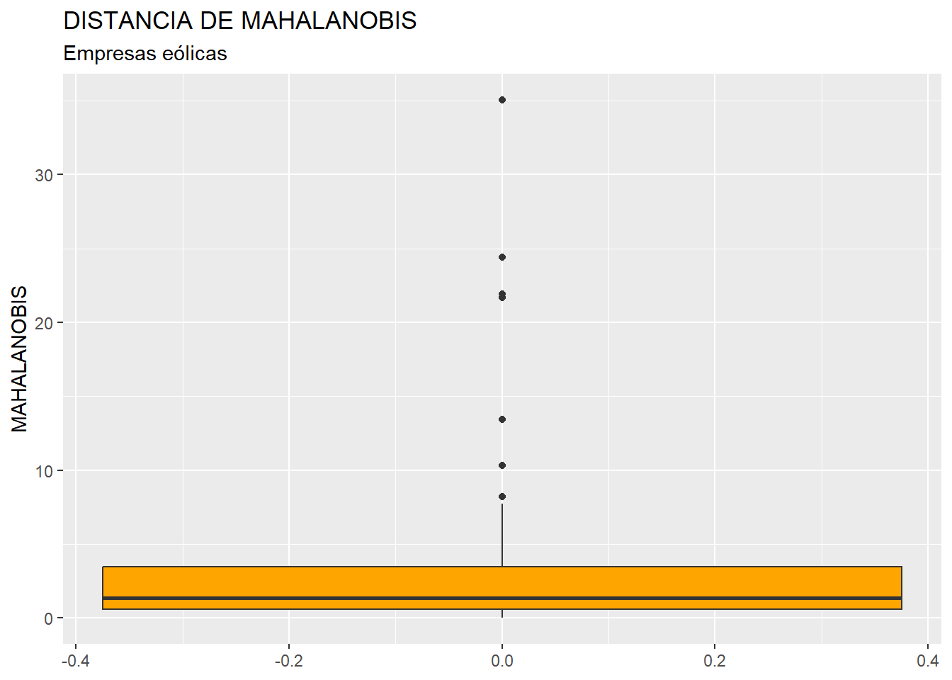 A continuación, construiremos un diagrama de caja de la variable MAHALANOBIS, como si fuera cualquier otra variable, a partir de la función ggplot() del paquete {ggplot2}: