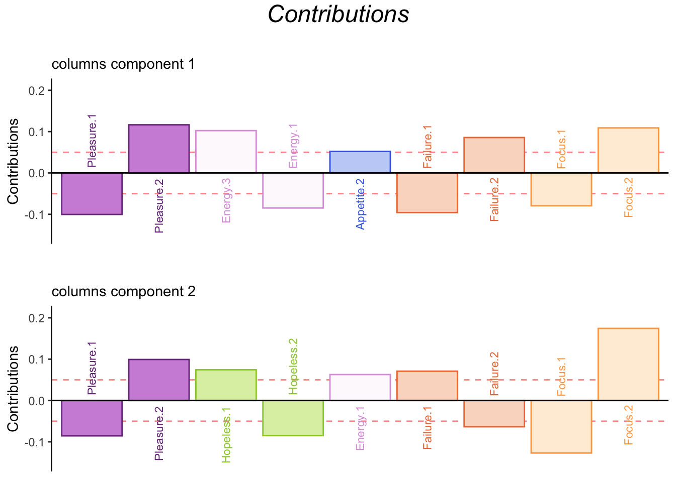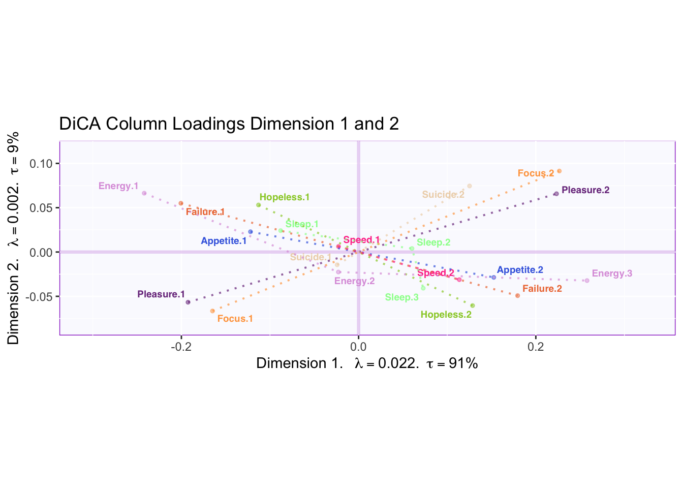 The column loadings plot shows that Energy.2 (several days) is more likely to be choosen along with “no days” on most of the other questions. Sleep.2 (several days) and Sleep.3 (more than half days or higher) is more likely to be choosen with “more than half the days or higher” on most of the other questions.