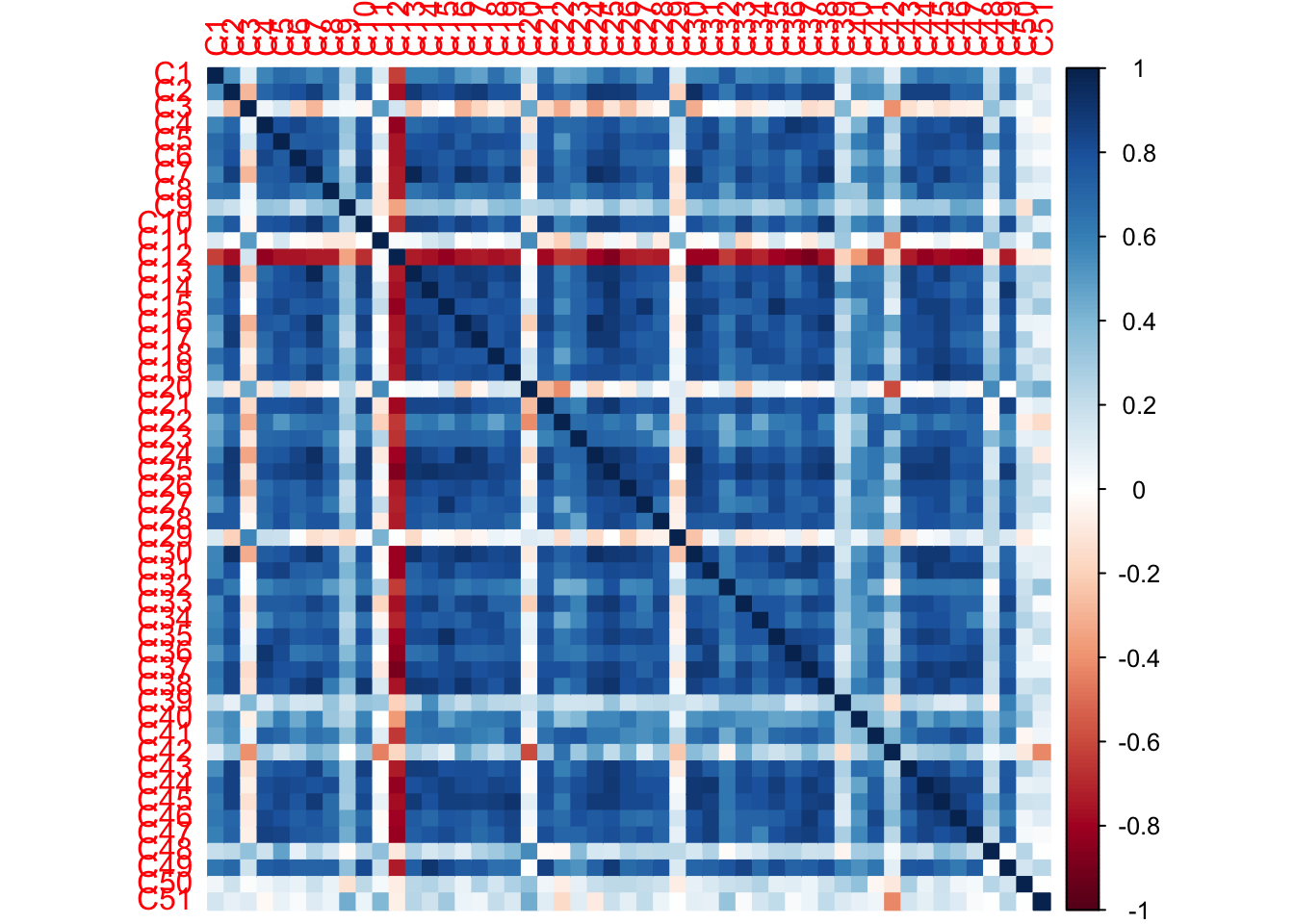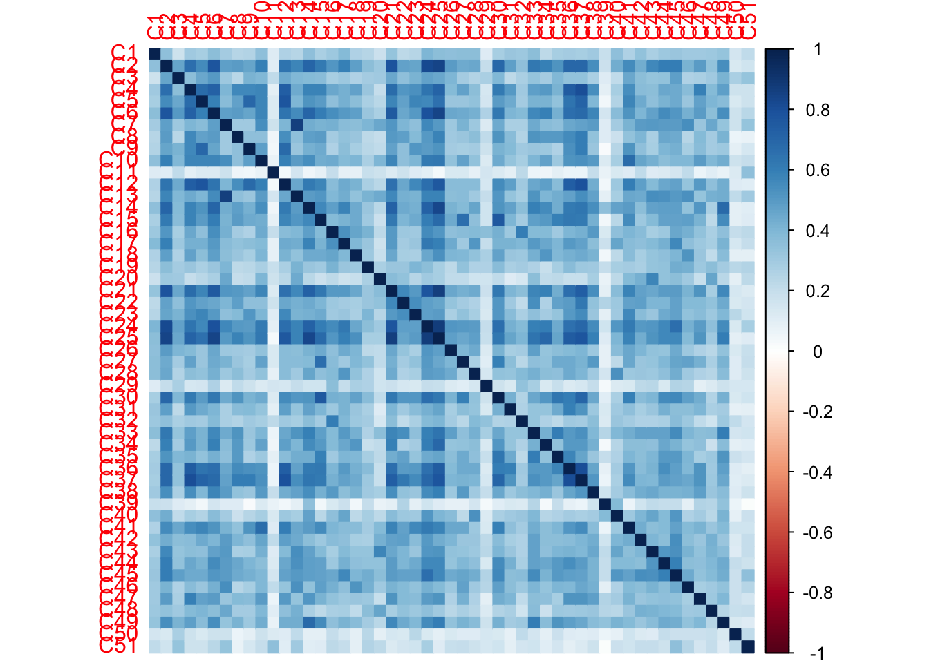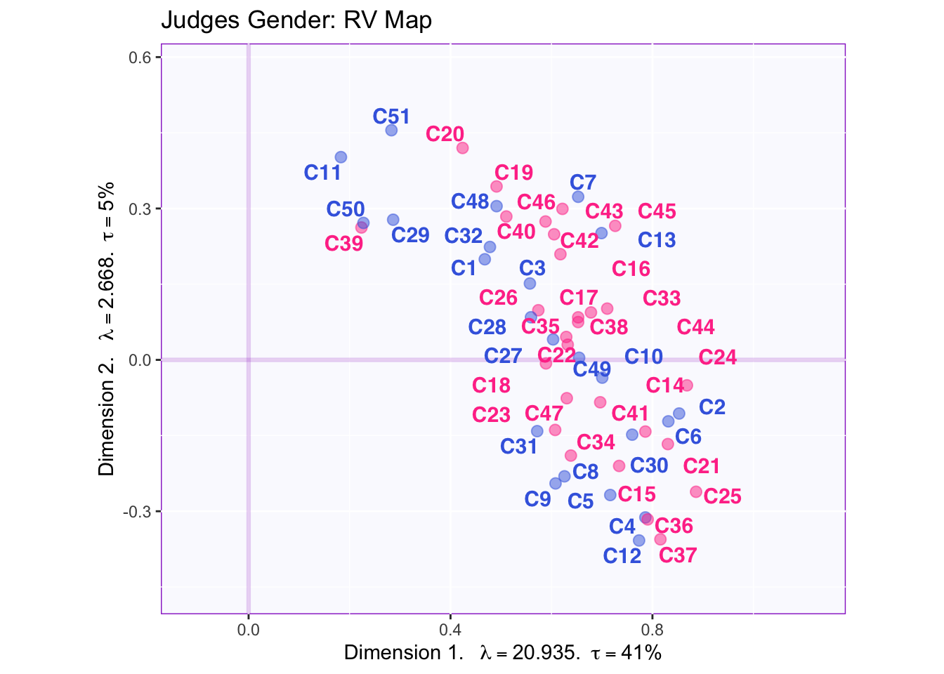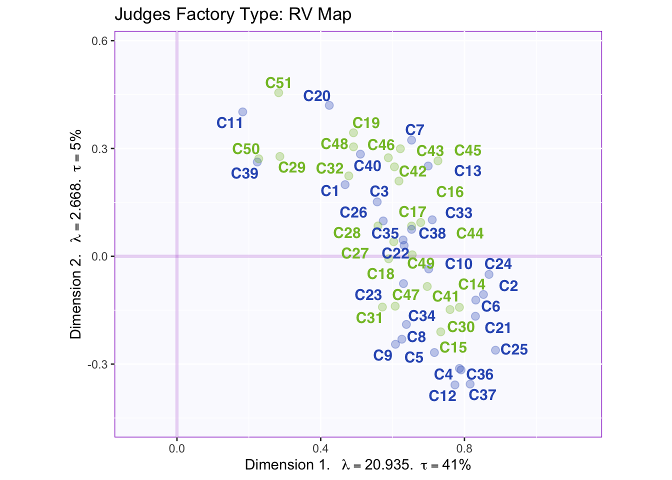 The Rv matrix correlation plot shows that all tables are positively correlated with each other i.e. each judge is their own table.