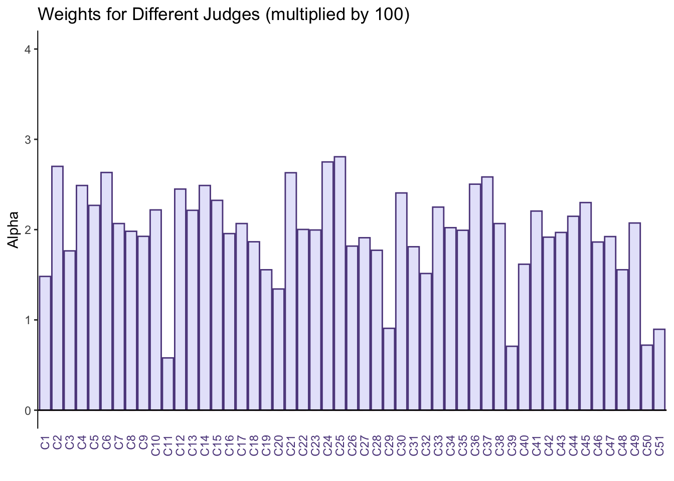 From the weights we can see taht judge 11, 29, 39, 50, and 51 sort the beers very differently from the rest of the judges.