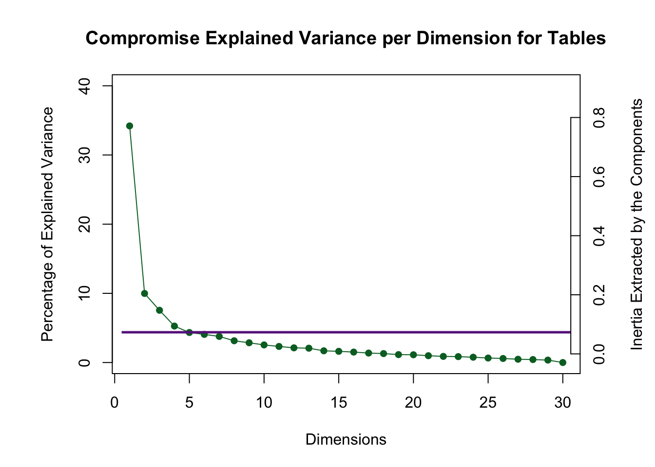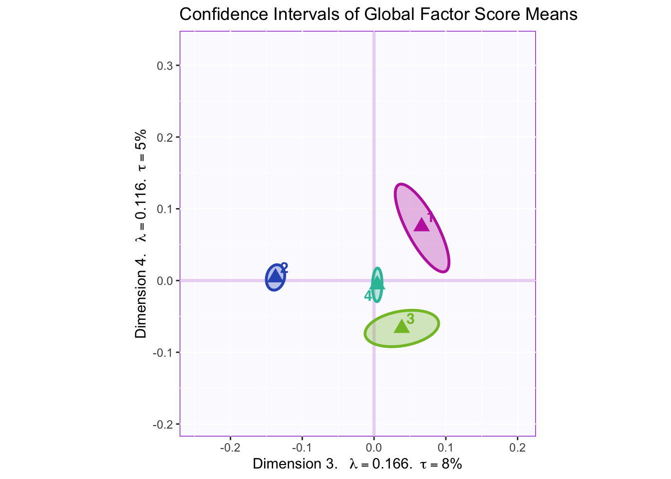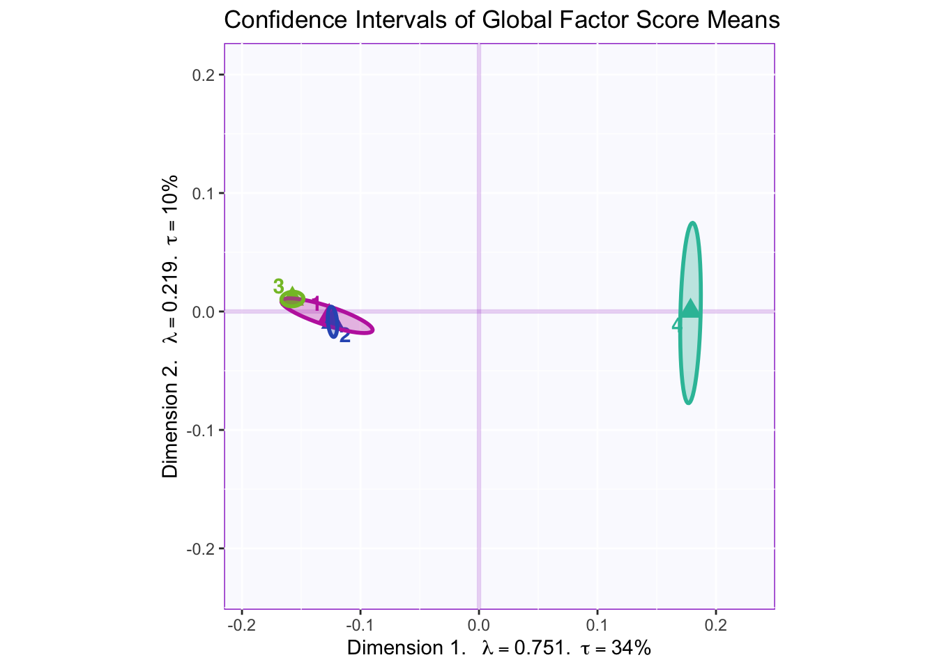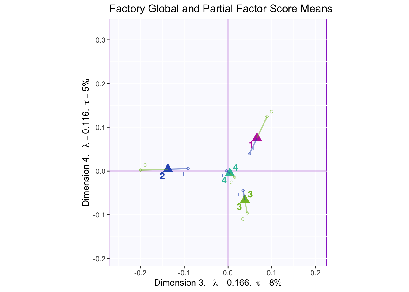 The compromise scree plot shows that the first four dimensions are above the Kaiser line. This is how we determine how many dimensions will be analyzed.