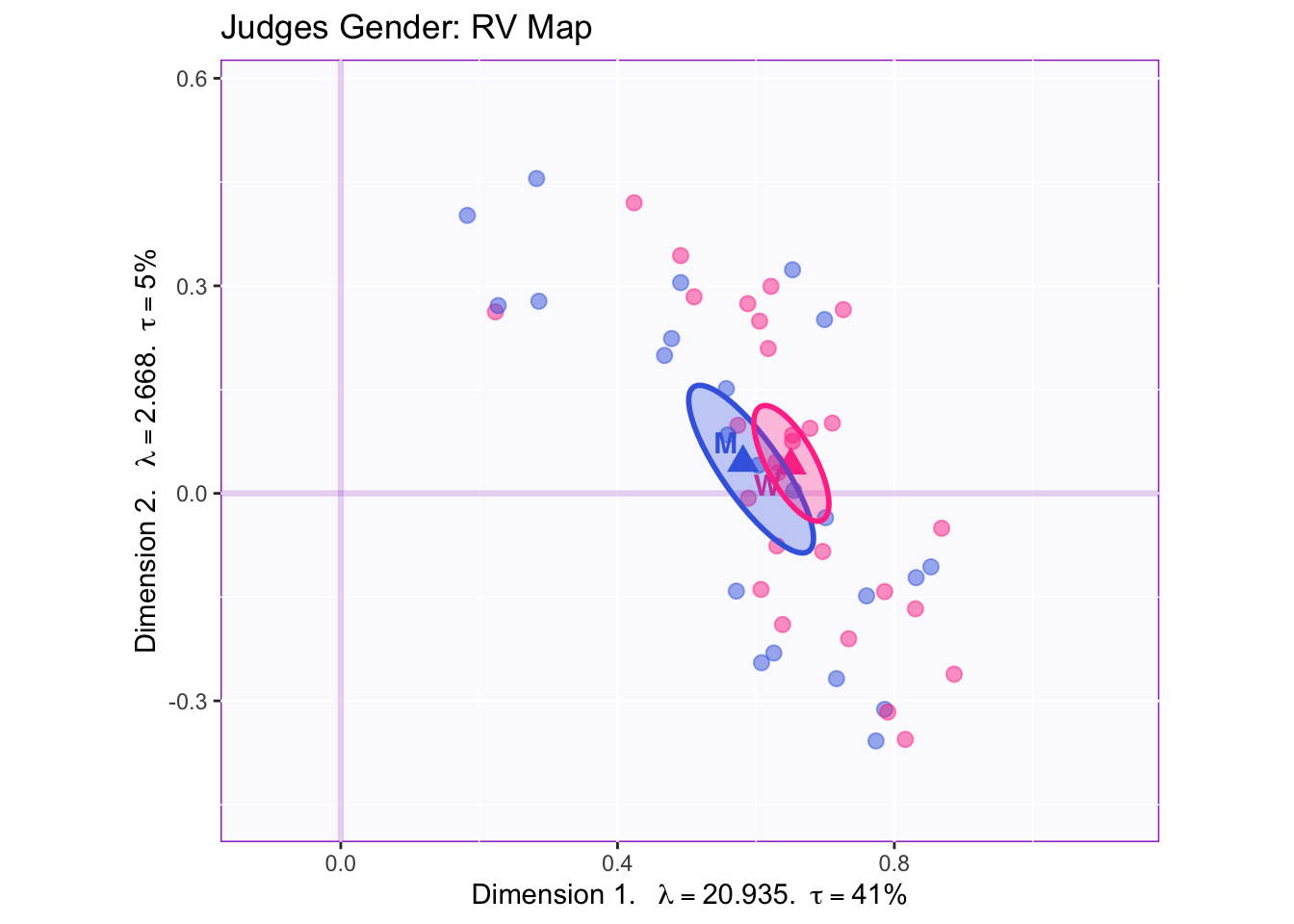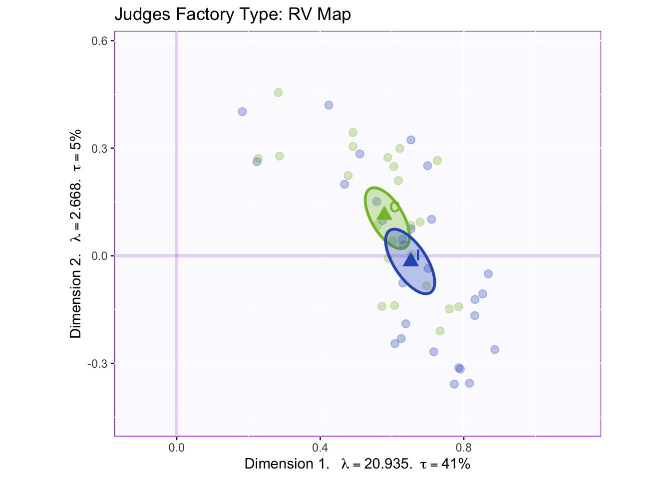 The Rv scree plot shows that the first two dimensions are above the Kaiser line and since there is such a large first dimension this is a signal that the judges are homogenous.