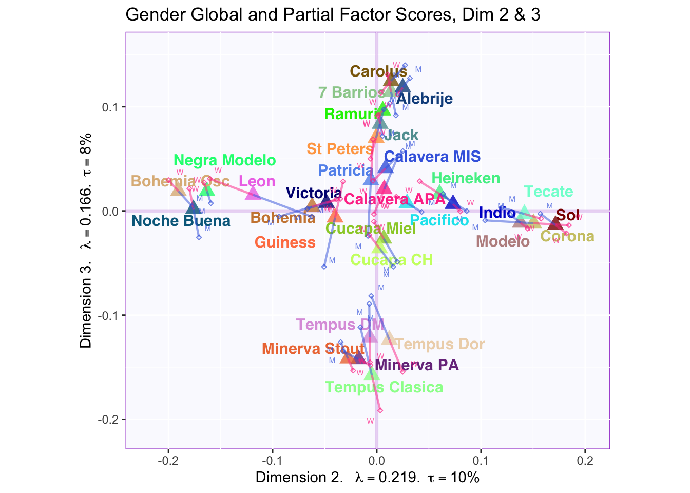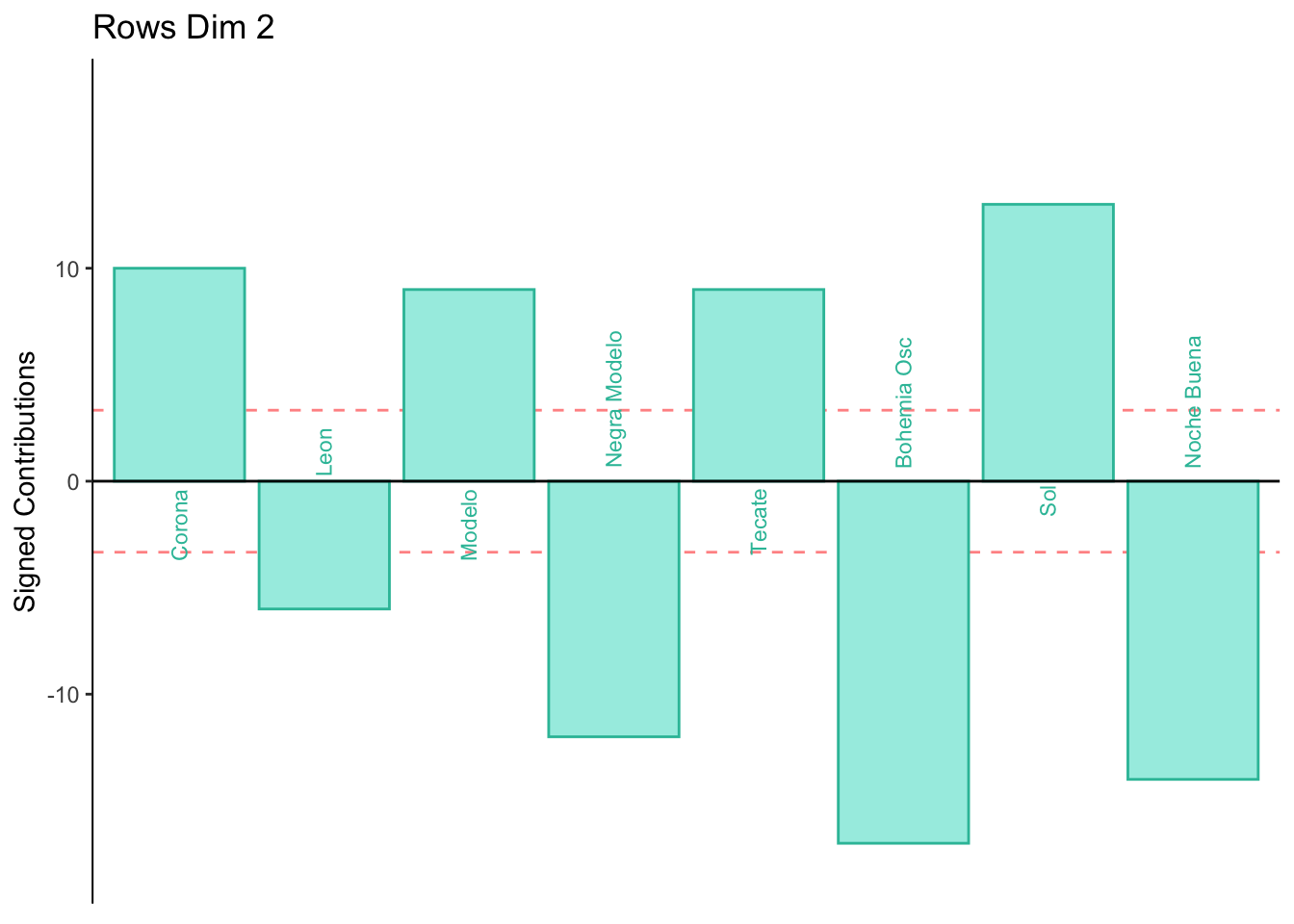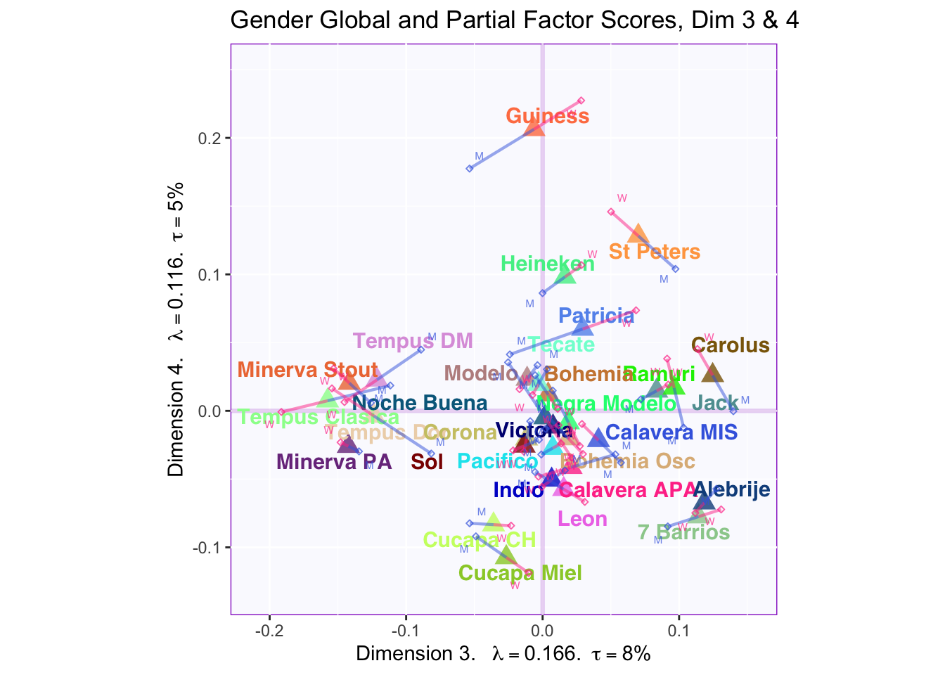 Dimension 2: Females or those who consume crafted beer sorted Corona, Modelo, Tecate, and Sol together (half of group 4).