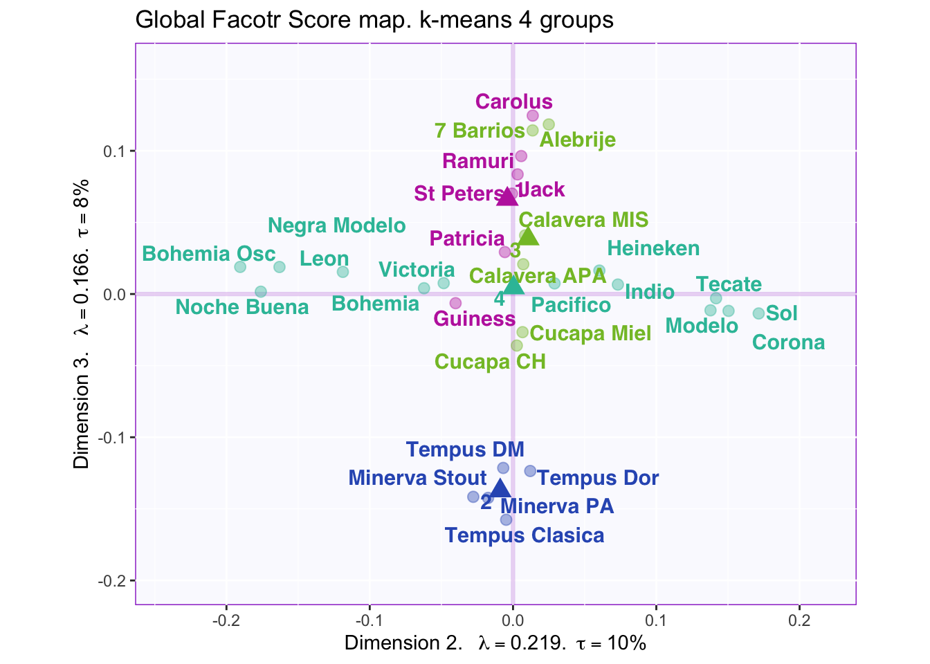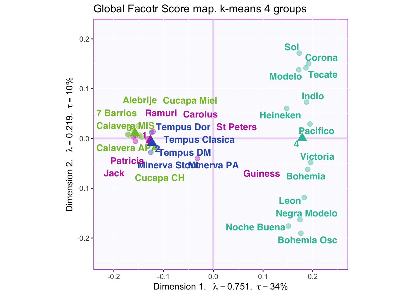 beer.kmeans <- kmeans(resDiSTATIS$res4Splus$F, centers = 4)