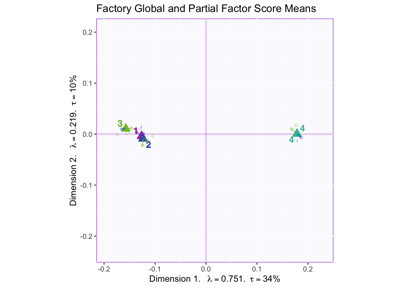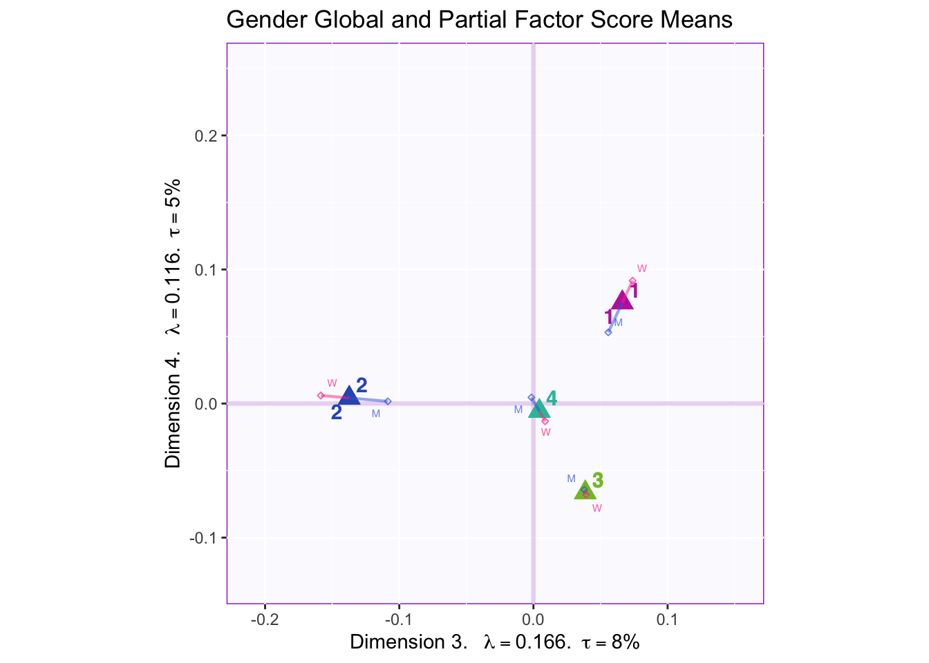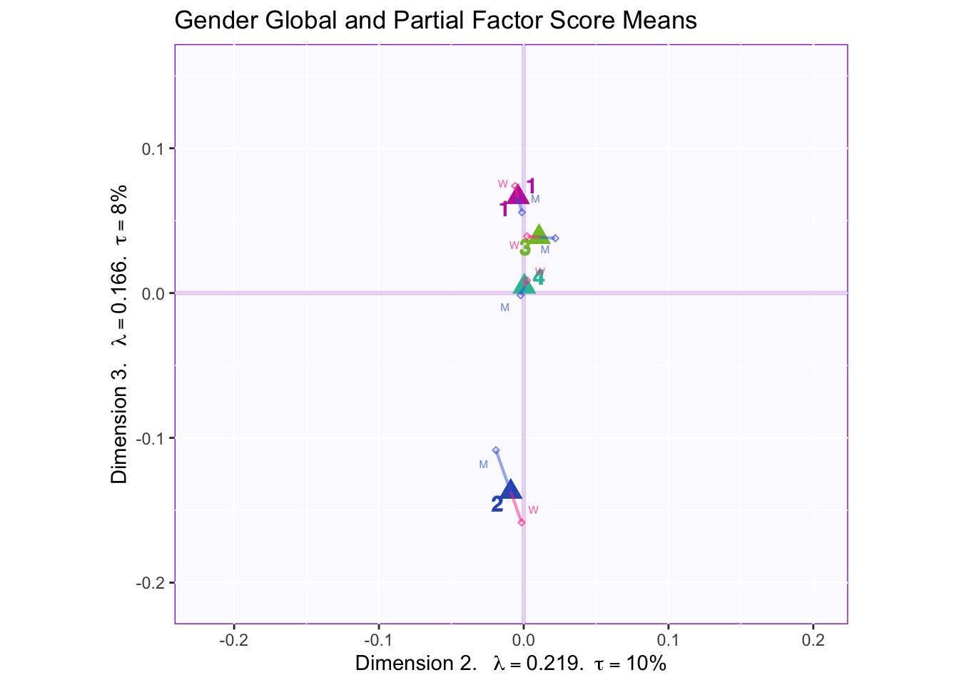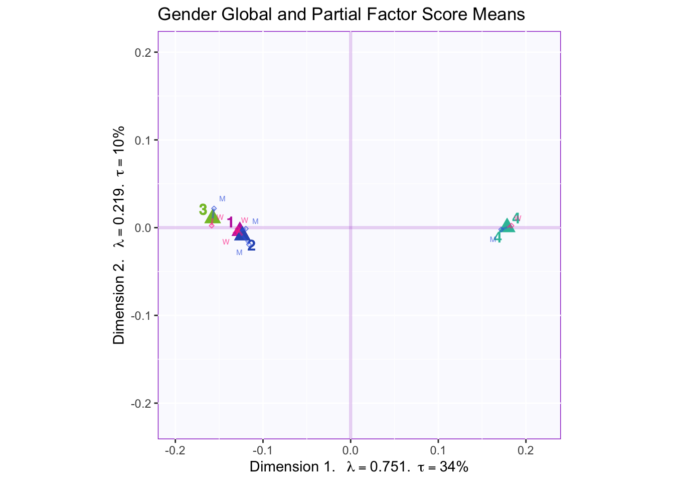 These plots are a bit messy, but from first appearnaces in the gender global and partial factor scores it looks as if men and women seem to be explaining similar amounts of variance.