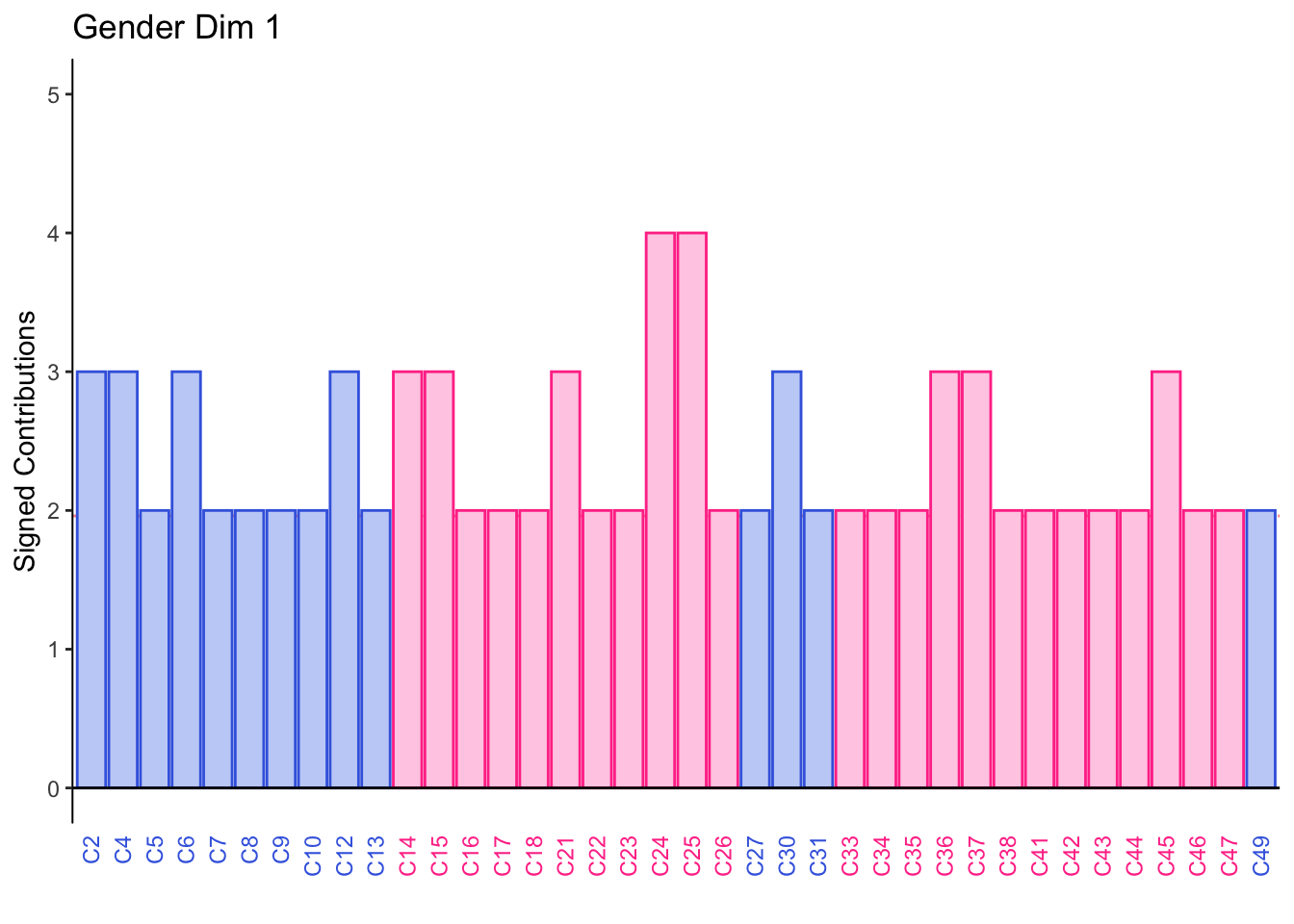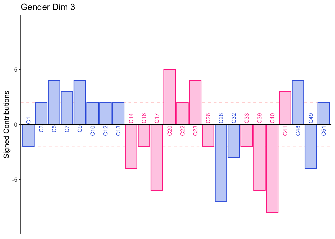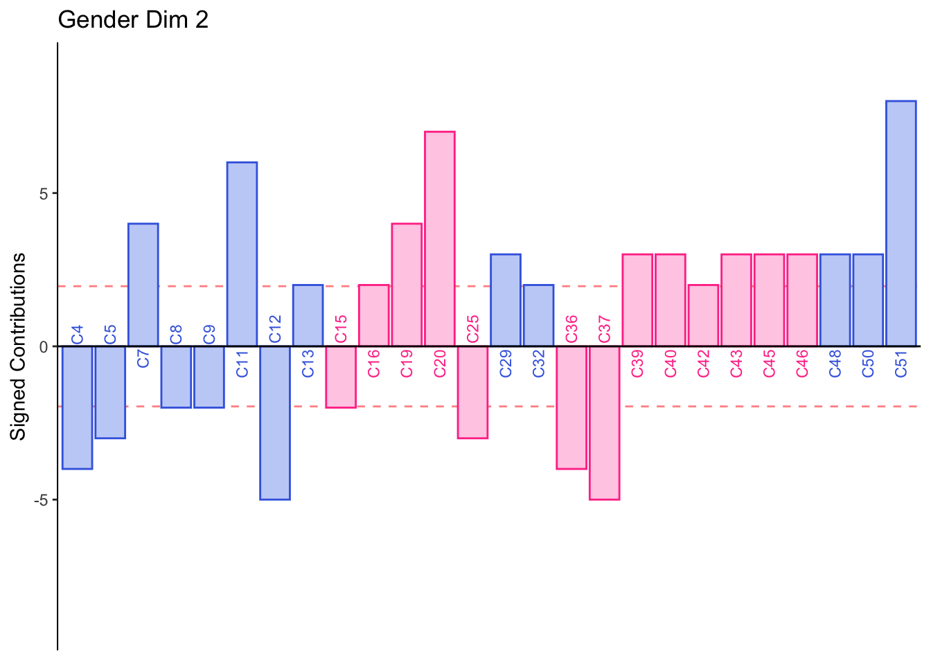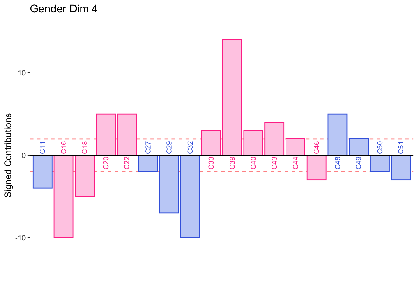 These plots are a bit messy, but from first appearnaces in the gender global and partial factor scores it looks as if men and women seem to be explaining similar amounts of variance.