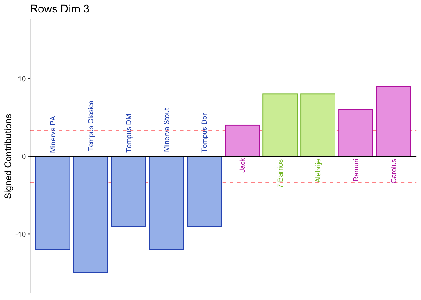Dimension 3: Males or those who consume indudstrial beer sorted Jack, 7 Barrios, Alebrije, Ramuri, and Carolus together (group 1 and 3).