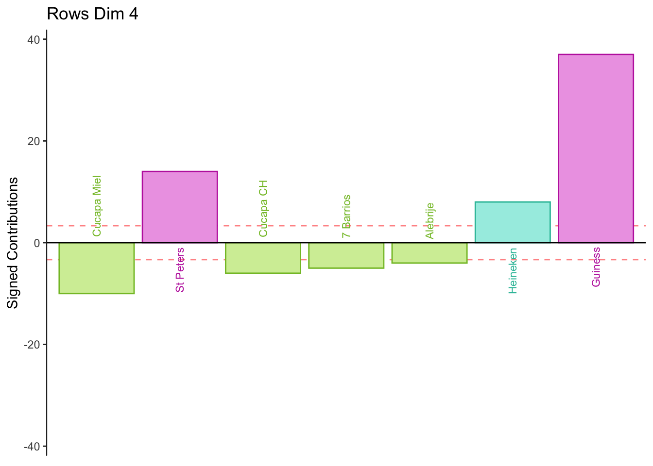 Dimension 4: Females or those who consume industrial beer sorted St. Peters, Heineken, and Guiness together (group 1 and 4).
