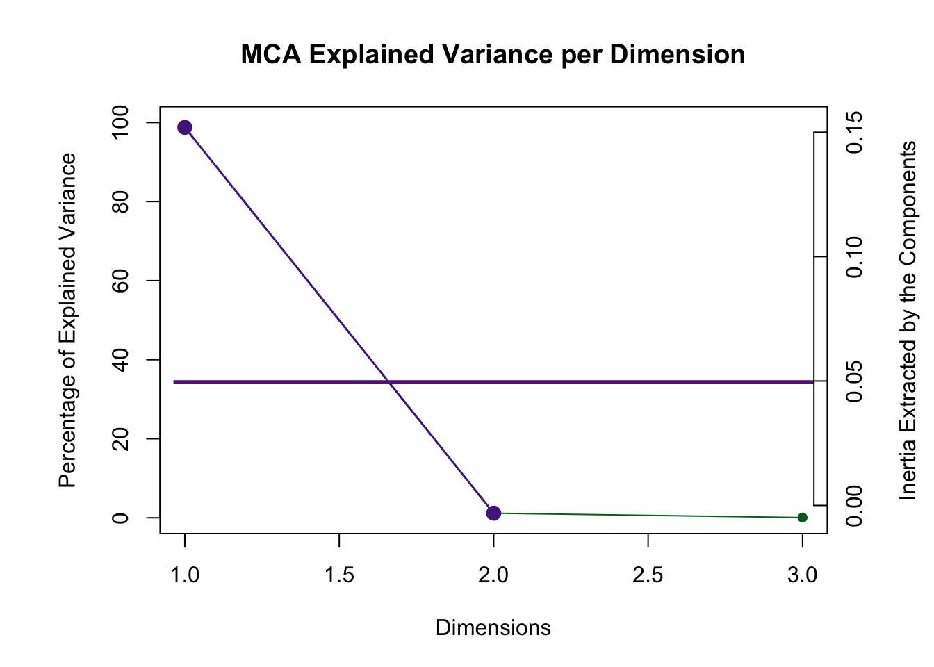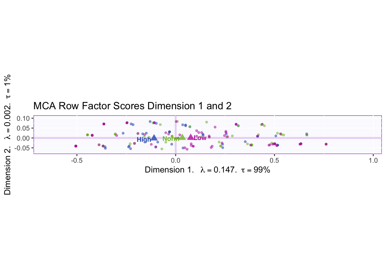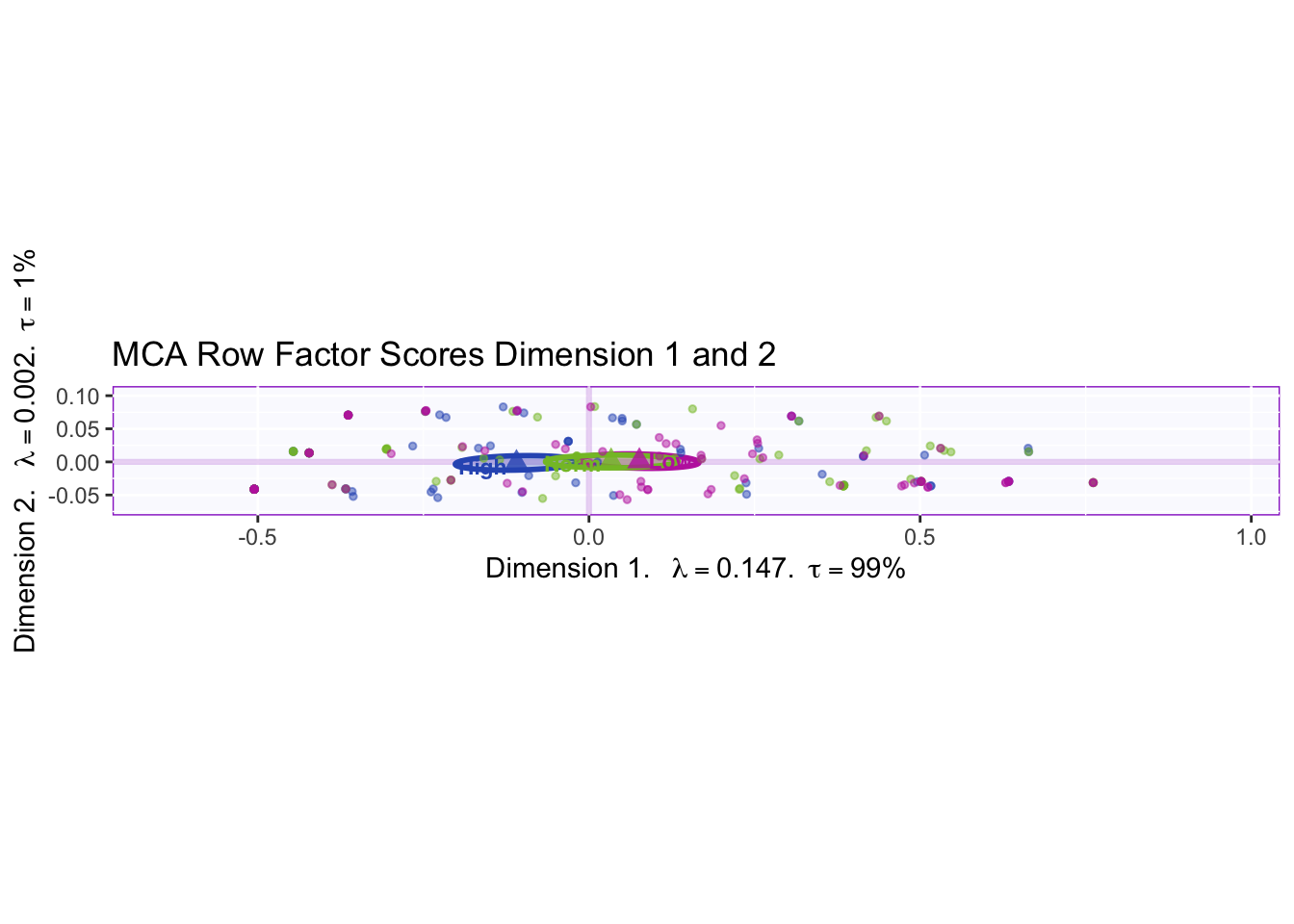 When we interpret the factor scores and loadings together, the MCA revealed: