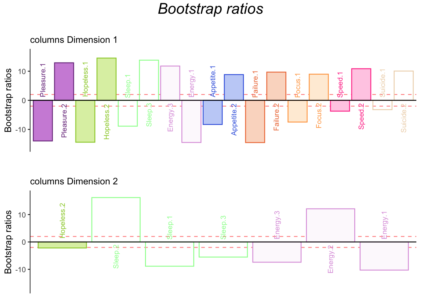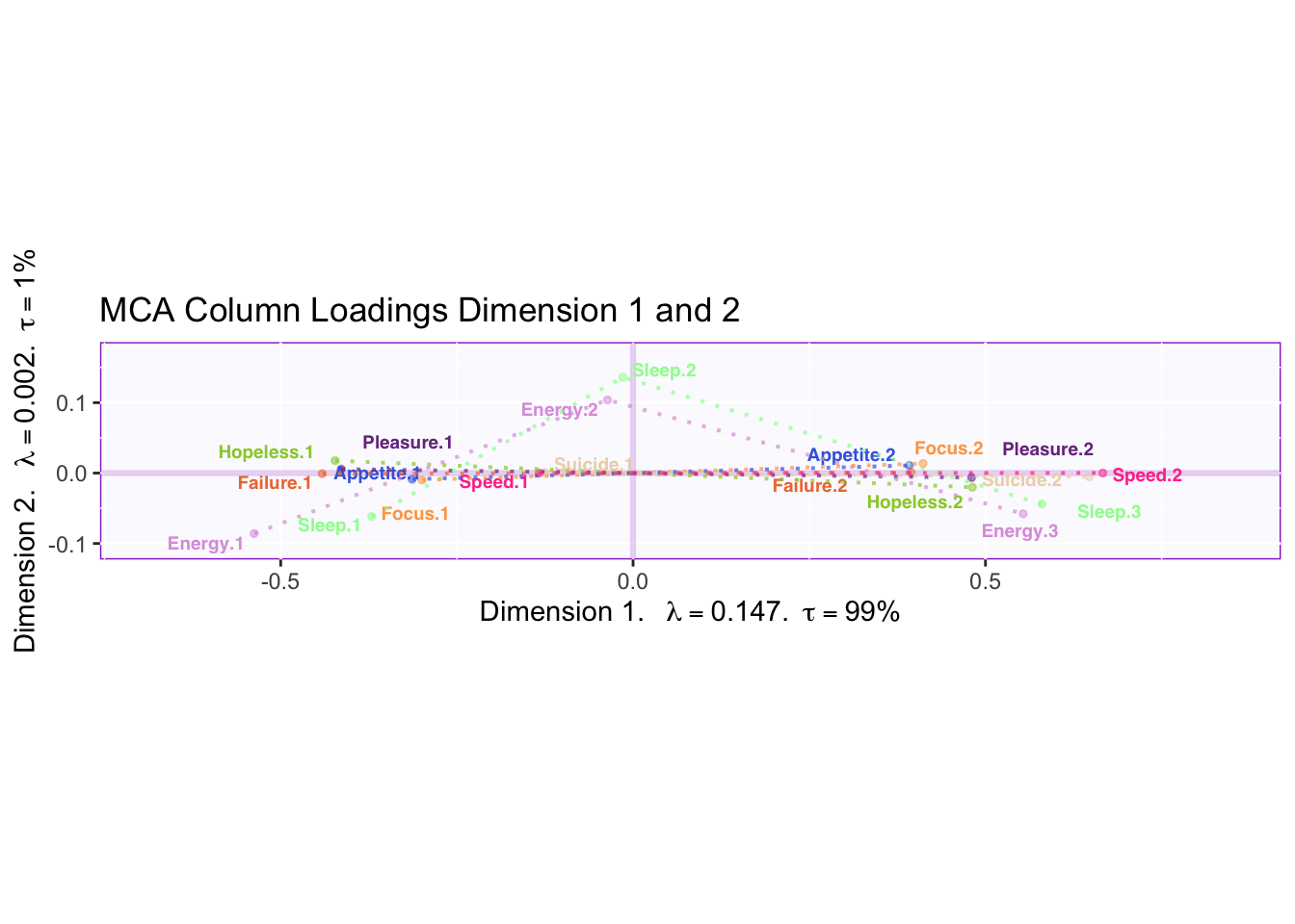 Dimension 1 is capturing the extreme differences while Dimension 2 is capturing the moderate answer of “several days.” However, “several days” is more similar to “no days” than “more than half the days.”